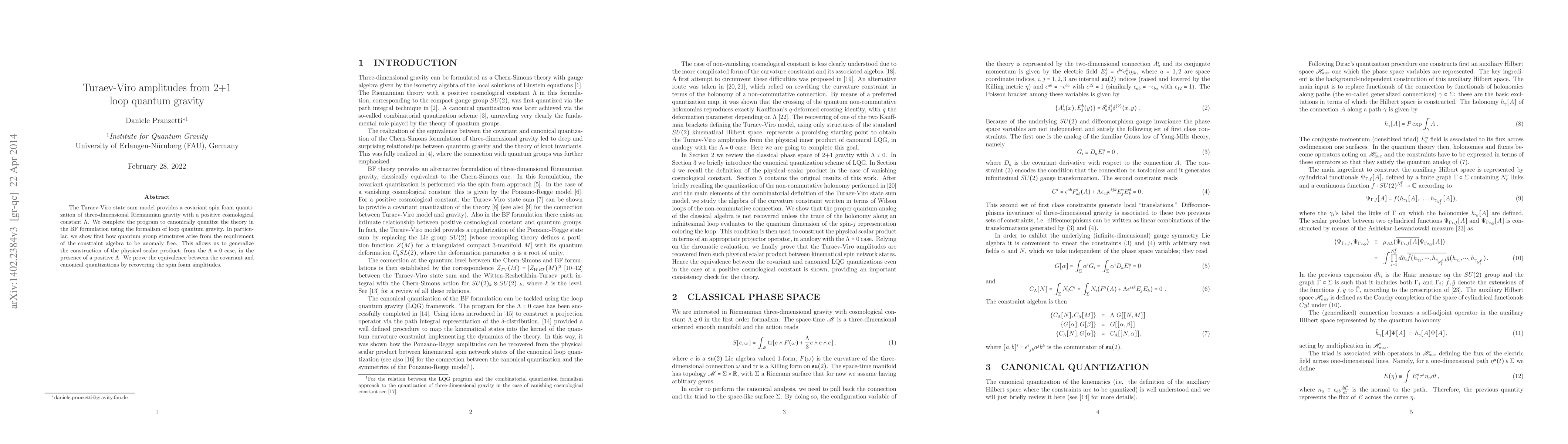 The Turaev-Viro state sum model provides a covariant spin foam quantization of three-dimensional Riemannian gravity with a positive cosmological constant {\Lambda}. We complete the program to canonically quantize the theory in the BF formulation using the formalism of Loop Quantum Gravity. In particular, we show first how quantum group structures arise from the requirement of the constraint algebra to be anomaly free. This allows us to generalize the construction of the physical scalar product, from the {\Lambda} = 0 case, in presence of a positive {\Lambda}. We prove the equivalence between the covariant and canonical quantizations by recovering the spin foam amplitudes.