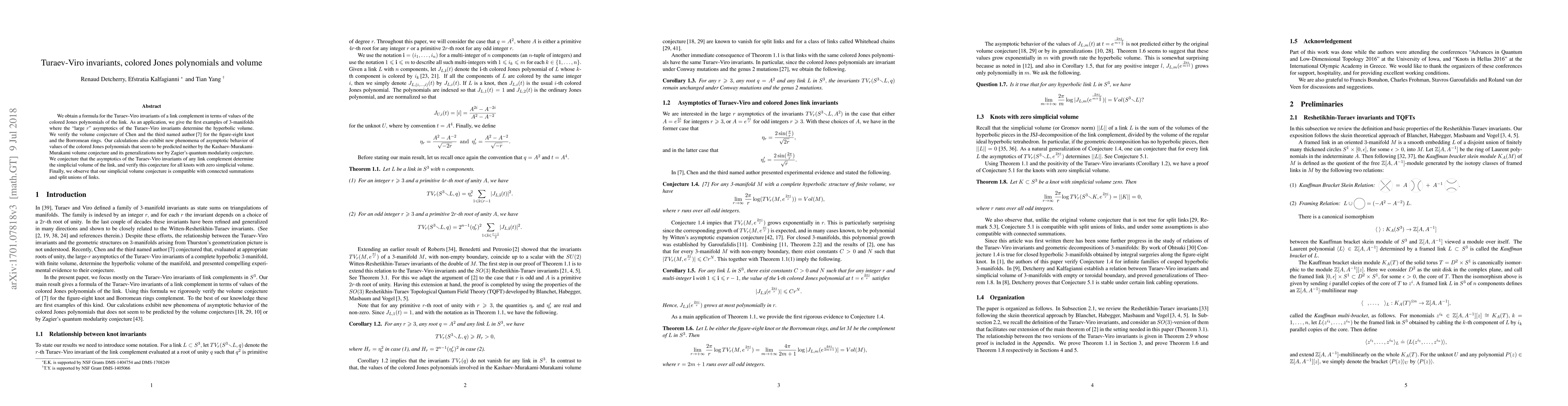 This research provides a formula linking Turaev-Viro invariants to colored Jones polynomials and verifies the volume conjecture for specific links, revealing unexpected asymptotic behaviors in colored Jones polynomials and proposing a new conjecture on the relationship between Turaev-Viro invariants and simplicial volume.