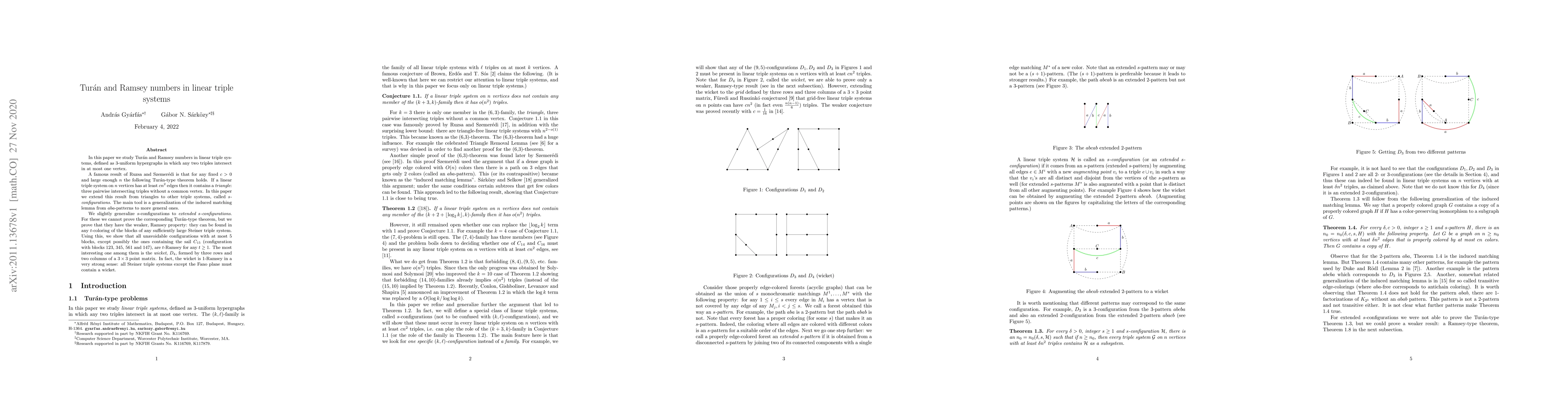 In this paper we study Tur\'an and Ramsey numbers in linear triple systems, defined as $3$-uniform hypergraphs in which any two triples intersect in at most one vertex. A famous result of Ruzsa and Szemer\'edi is that for any fixed $c>0$ and large enough $n$ the following Tur\'an-type theorem holds. If a linear triple system on $n$ vertices has at least $cn^2$ edges then it contains a {\em triangle}: three pairwise intersecting triples without a common vertex. In this paper we extend this result from triangles to other triple systems, called {\em $s$-configurations}. The main tool is a generalization of the induced matching lemma from $aba$-patterns to more general ones. We slightly generalize $s$-configurations to {\em extended $s$-configurations}. For these we cannot prove the corresponding Tur\'an-type theorem, but we prove that they have the weaker, Ramsey property: they can be found in any $t$-coloring of the blocks of any sufficiently large Steiner triple system. Using this, we show that all unavoidable configurations with at most 5 blocks, except possibly the ones containing the sail $C_{15}$ (configuration with blocks 123, 345, 561 and 147), are $t$-Ramsey for any $t\geq 1$. The most interesting one among them is the {\em wicket}, $D_4$, formed by three rows and two columns of a $3\times 3$ point matrix. In fact, the wicket is $1$-Ramsey in a very strong sense: all Steiner triple systems except the Fano plane must contain a wicket.
