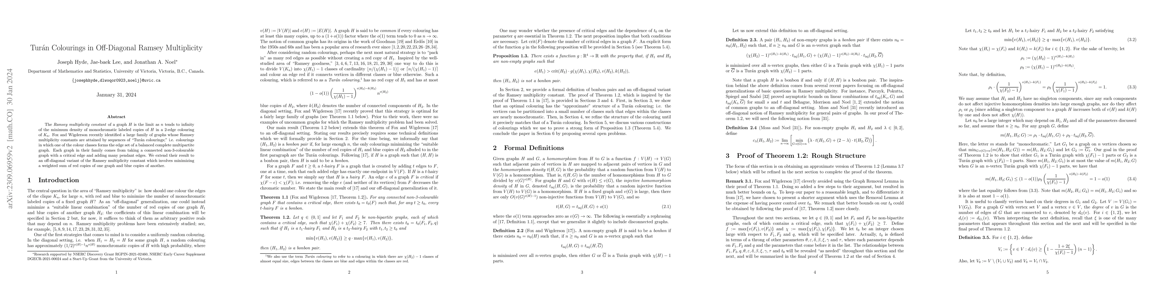 The paper introduces and analyzes an off-diagonal variant of the Ramsey multiplicity constant, extending previous work on Turán colourings.