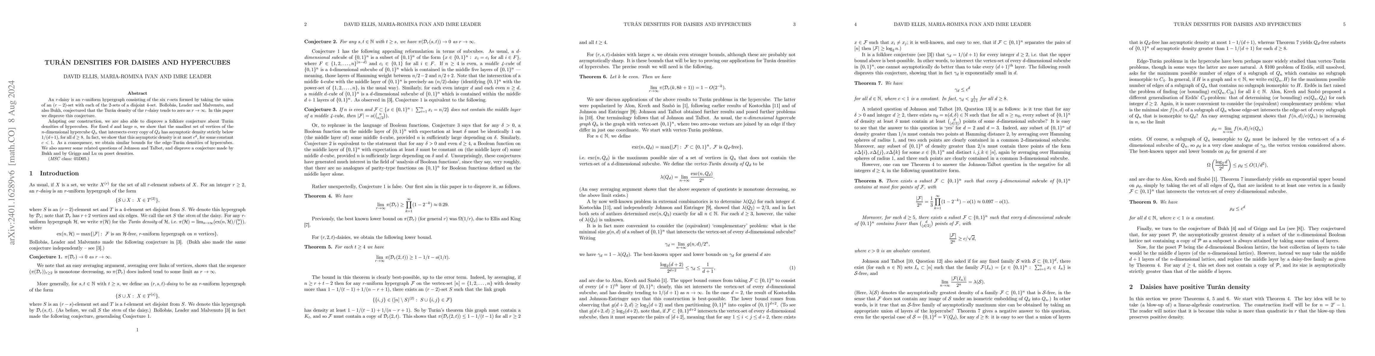 An $r$-daisy is an $r$-uniform hypergraph consisting of the six $r$-sets formed by taking the union of an $(r-2)$-set with each of the 2-sets of a disjoint 4-set. Bollob\'as, Leader and Malvenuto, and also Bukh, conjectured that the Tur\'an density of the $r$-daisy tends to zero as $r \to \infty$. In this paper we disprove this conjecture. Adapting our construction, we are also able to disprove a folklore conjecture about Tur\'an densities of hypercubes. For fixed $d$ and large $n$, we show that the smallest set of vertices of the $n$-dimensional hypercube $Q_n$ that meets every copy of $Q_d$ has asymptotic density strictly below $1/(d+1)$, for all $d \geq 8$. In fact, we show that this asymptotic density is at most $c^d$, for some constant $c<1$. As a consequence, we obtain similar bounds for the edge-Tur\'an densities of hypercubes. We also answer some related questions of Johnson and Talbot, and disprove a conjecture made by Bukh and by Griggs and Lu on poset densities.