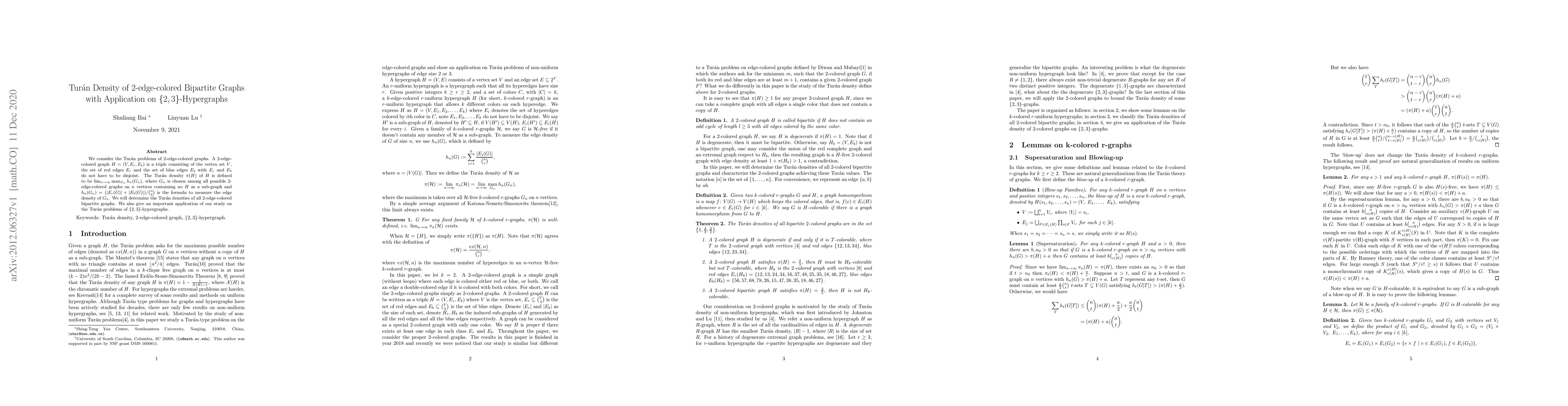 This paper determines the Turán densities for all 2-edge-colored bipartite graphs, providing a measure of edge density while avoiding specific subgraphs. It also applies these findings to study the Turán problems of $\{2, 3\}$-hypergraphs.