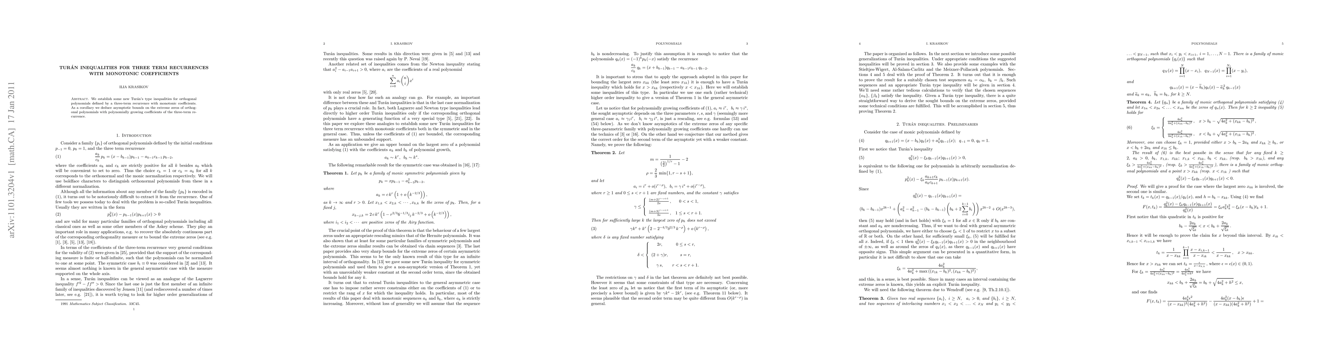 We establish some new Tur\'an's type inequalities for orthogonal polynomials defined by a three-term recurrence with monotonic coefficients. As a corollary we deduce asymptotic bounds on the extreme zeros of orthogonal polynomials with polynomially growing coefficients of the three-term recurrence.