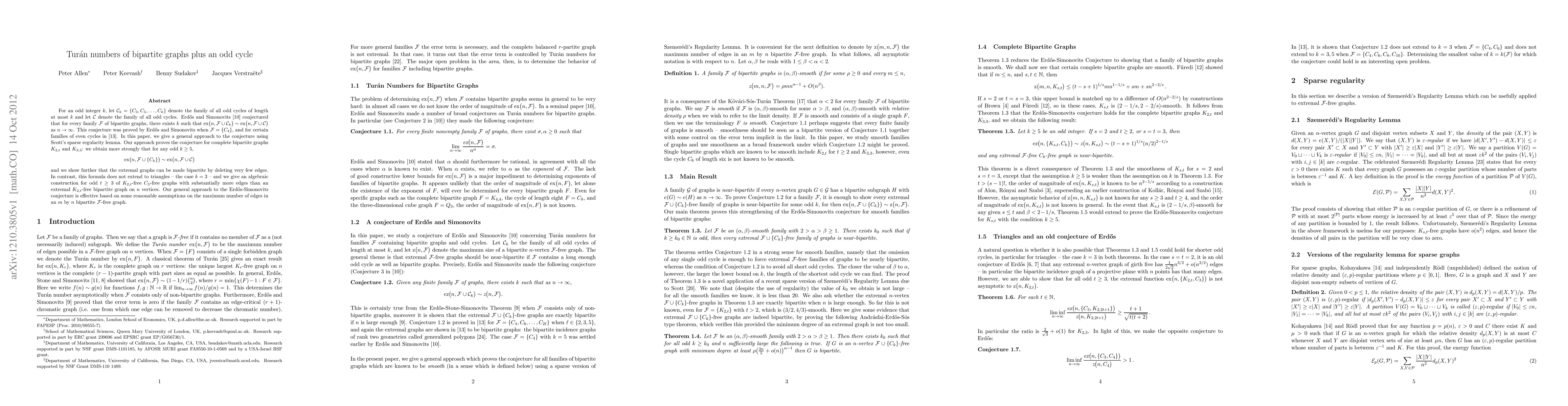 For an odd integer $k$, let $\mathcal{C}_k = \{C_3,C_5,...,C_k\}$ denote the family of all odd cycles of length at most $k$ and let $\mathcal{C}$ denote the family of all odd cycles. Erd\H{o}s and Simonovits \cite{ESi1} conjectured that for every family $\mathcal{F}$ of bipartite graphs, there exists $k$ such that $\ex{n}{\mathcal{F} \cup \mathcal{C}_k} \sim \ex{n}{\mathcal{F} \cup \mathcal{C}}$ as $n \rightarrow \infty$. This conjecture was proved by Erd\H{o}s and Simonovits when $\mathcal{F} = \{C_4\}$, and for certain families of even cycles in \cite{KSV}. In this paper, we give a general approach to the conjecture using Scott's sparse regularity lemma. Our approach proves the conjecture for complete bipartite graphs $K_{2,t}$ and $K_{3,3}$: we obtain more strongly that for any odd $k \geq 5$, \[ \ex{n}{\mathcal{F} \cup \{C_k\}} \sim \ex{n}{\mathcal{F} \cup \mathcal{C}}\] and we show further that the extremal graphs can be made bipartite by deleting very few edges. In contrast, this formula does not extend to triangles -- the case $k = 3$ -- and we give an algebraic construction for odd $t \geq 3$ of $K_{2,t}$-free $C_3$-free graphs with substantially more edges than an extremal $K_{2,t}$-free bipartite graph on $n$ vertices. Our general approach to the Erd\H{o}s-Simonovits conjecture is effective based on some reasonable assumptions on the maximum number of edges in an $m$ by $n$ bipartite $\mathcal{F}$-free graph.