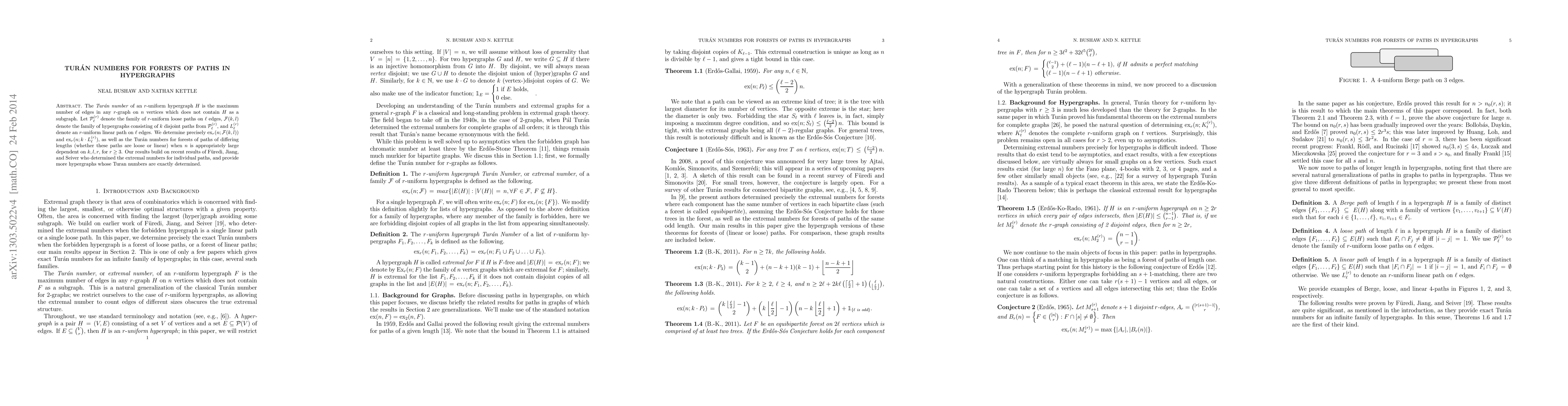 The Tur\'an number of an r-uniform hypergraph H is the maximum number of edges in any r-graph on n vertices which does not contain H as a subgraph. Let P_l^(r) denote the family of r-uniform loose paths on l edges, F(k,l) denote the family of hypergraphs consisting of k disjoint paths from P_l^(r), and P'_l^(r) denote an r-uniform linear path on l edges. We determine precisely ex_r(n;F(k,l)) and ex_r(n;k*P'_l^(r)), as well as the Tur\'an numbers for forests of paths of differing lengths (whether these paths are loose or linear) when n is appropriately large dependent on k,l,r, for r>=3. Our results build on recent results of F\"uredi, Jiang, and Seiver who determined the extremal numbers for individual paths, and provide more hypergraphs whose Turan numbers are exactly determined.