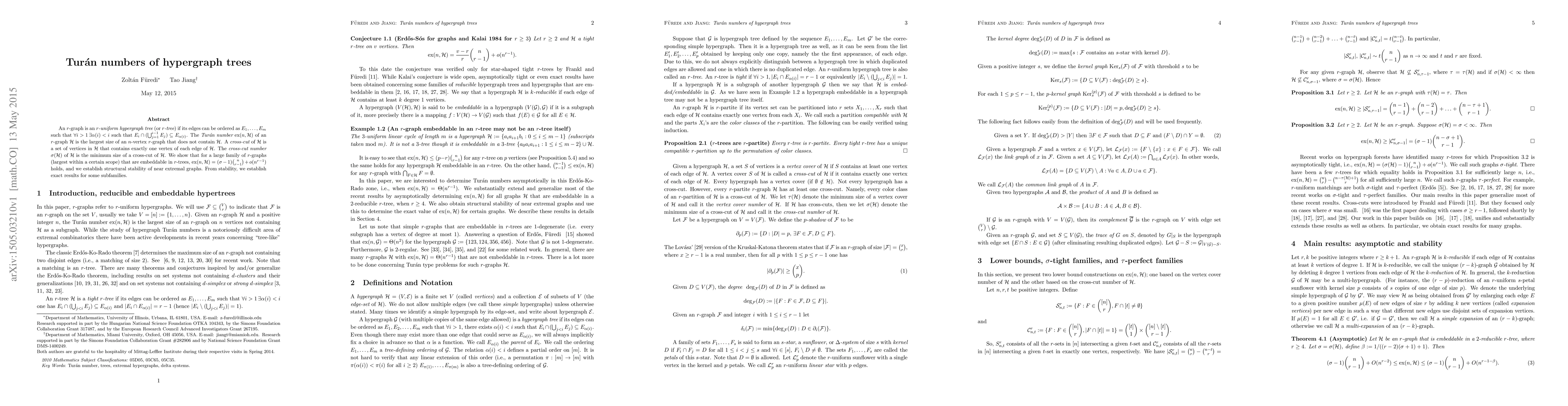 The paper establishes that for a large family of r-graphs embeddable in r-trees, the Turan number is approximately equal to (¬sigma-1)← “bin(n,r-1) + o(n^{r-1}), where ¬sigma is the cross-cut number and n is the vertex number.