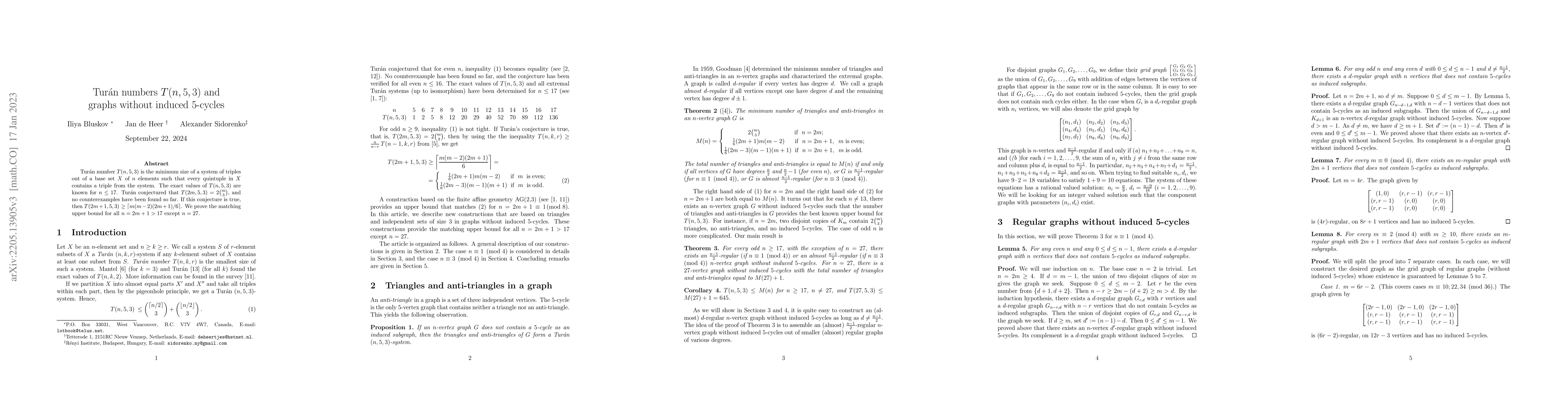 Tur\'{a}n number $T(n,5,3)$ is the minimum size of a system of triples out of a base set $X$ of $n$ elements such that every quintuple in $X$ contains a triple from the system. The exact values of $T(n,5,3)$ are known for $n \leq 17$. Tur\'{a}n conjectured that $T(2m,5,3) = 2\binom{m}{3}$, and no counterexamples have been found so far. If this conjecture is true, then $T(2m+1,5,3) \geq \lceil m(m-2)(2m+1)/6\rceil$. We prove the matching upper bound for all $n = 2m+1 > 17$ except $n=27$.