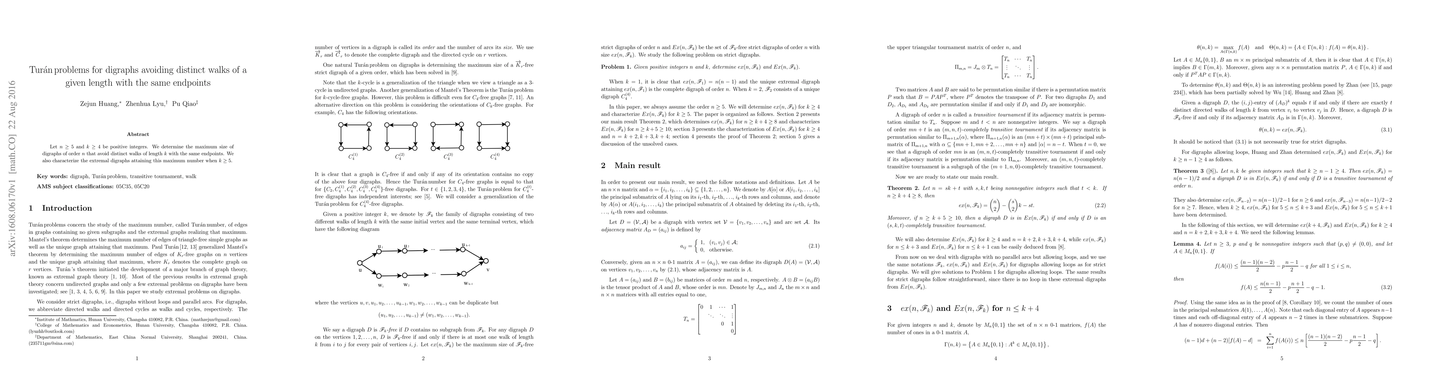 The paper studies digraphs that avoid distinct walks of a given length with the same endpoints, determining their maximum size and characterizing the extremal digraphs when k >= 5.