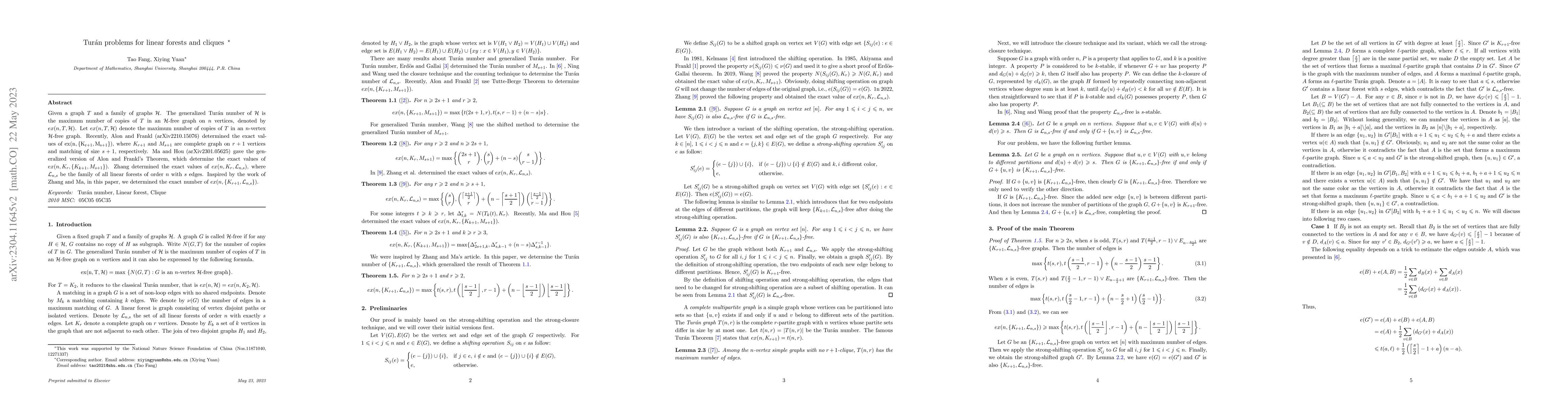 Given a graph $T$ and a family of graphs $\mathcal{H}$. The generalized Tur\'an number of $\mathcal{H}$ is the maximum number of copies of $T$ in an $\mathcal{H}$-free graph on $n$ vertices, denoted by $ex(n, T, \mathcal{H})$. Let $ex(n, T, \mathcal{H})$ denote the maximum number of copies of $T$ in an $n$-vertex $\mathcal{H}$-free graph. Recently, Alon and Frankl (arXiv2210.15076) determined the exact values of $\rm{ex}(n, \{K_{r+1}, M_{s+1}\})$, where $K_{r+1}$ and $M_{s+1}$ are complete graph on $r + 1$ vertices and matching of size $s + 1$, respectively. Ma and Hou (arXiv2301.05625) gave the generalized version of Alon and Frankl's Theorem, which determine the exact values of $ex(n, K_r, \{K_{k+1}, M_{s+1}\})$. Zhang determined the exact values of $ex(n, K_r, \mathcal{L}_{n, s})$, where $\mathcal{L}_{n, s}$ be the family of all linear forests of order $n$ with $s$ edges. Inspired by the work of Zhang and Ma, in this paper, we determined the exact number of $ex(n, \{K_{r+1}, \mathcal{L}_{n, s}\})$.