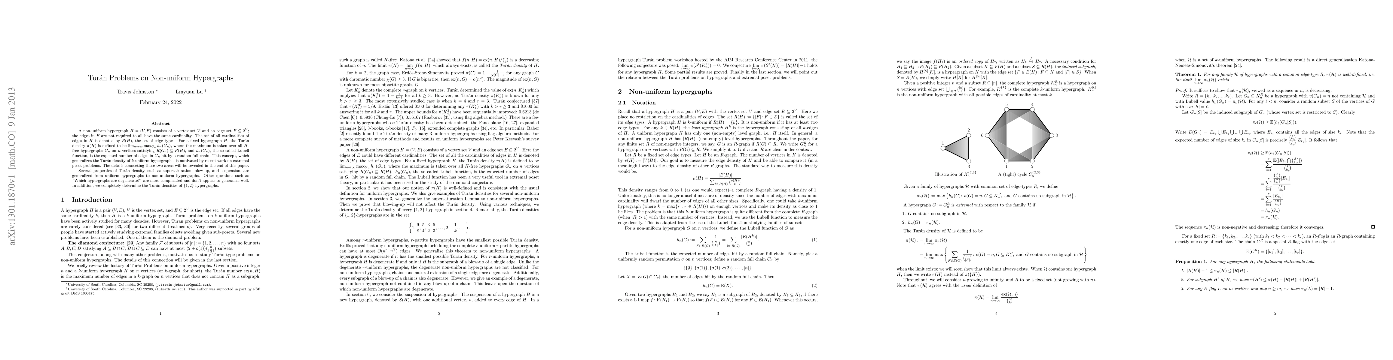 A non-uniform hypergraph $H=(V,E)$ consists of a vertex set $V$ and an edge set $E\subseteq 2^V$; the edges in $E$ are not required to all have the same cardinality. The set of all cardinalities of edges in $H$ is denoted by $R(H)$, the set of edge types. For a fixed hypergraph $H$, the Tur\'an density $\pi(H)$ is defined to be $\lim_{n\to\infty}\max_{G_n}h_n(G_n)$, where the maximum is taken over all $H$-free hypergraphs $G_n$ on $n$ vertices satisfying $R(G_n)\subseteq R(H)$, and $h_n(G_n)$, the so called Lubell function, is the expected number of edges in $G_n$ hit by a random full chain. This concept, which generalizes the Tur\'an density of $k$-uniform hypergraphs, is motivated by recent work on extremal poset problems. The details connecting these two areas will be revealed in the end of this paper. Several properties of Tur\'an density, such as supersaturation, blow-up, and suspension, are generalized from uniform hypergraphs to non-uniform hypergraphs. Other questions such as "Which hypergraphs are degenerate?" are more complicated and don't appear to generalize well. In addition, we completely determine the Tur\'an densities of ${1,2}$-hypergraphs.