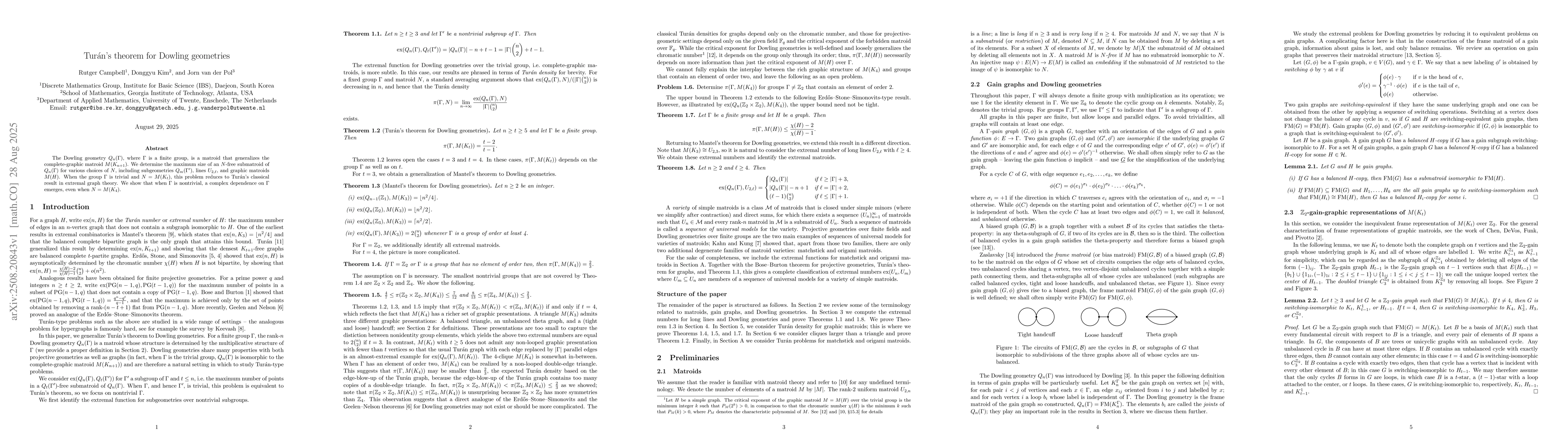 The Dowling geometry $Q_n(\Gamma)$, where $\Gamma$ is a finite group, is a matroid that generalizes the complete-graphic matroid $M(K_{n+1})$. We determine the maximum size of an $N$-free submatroid of $Q_n(\Gamma)$ for various choices of $N$, including subgeometries $Q_m(\Gamma')$, lines $U_{2,\ell}$, and graphic matroids $M(H)$. When the group $\Gamma$ is trivial and $N=M(K_t)$, this problem reduces to Tur\'{a}n's classical result in extremal graph theory. We show that when $\Gamma$ is nontrivial, a complex dependence on $\Gamma$ emerges, even when $N=M(K_4)$.