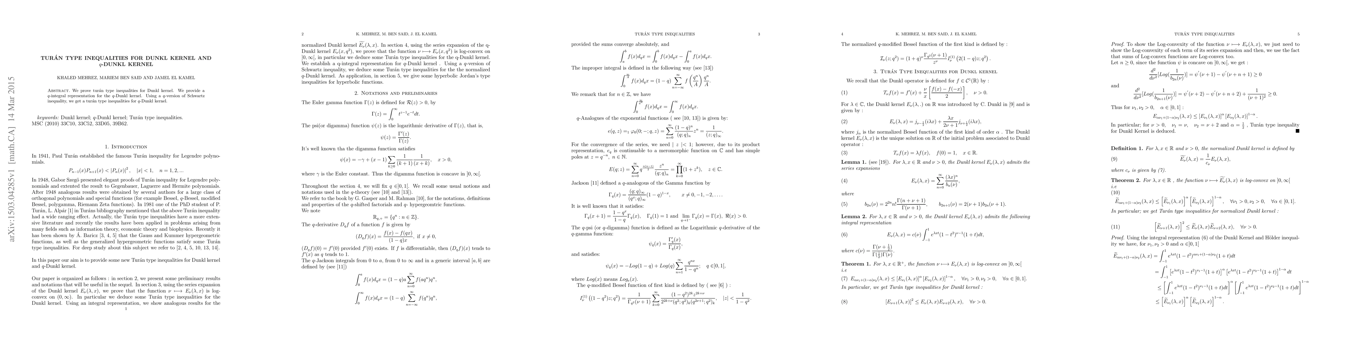 This paper proves Turán type inequalities for the Dunkl kernel and establishes a $q$-integral representation for the $q$-Dunkl kernel. It utilizes a $q$-version of the Schwartz inequality to derive Turán type inequalities for the $q$-Dunkl kernel.