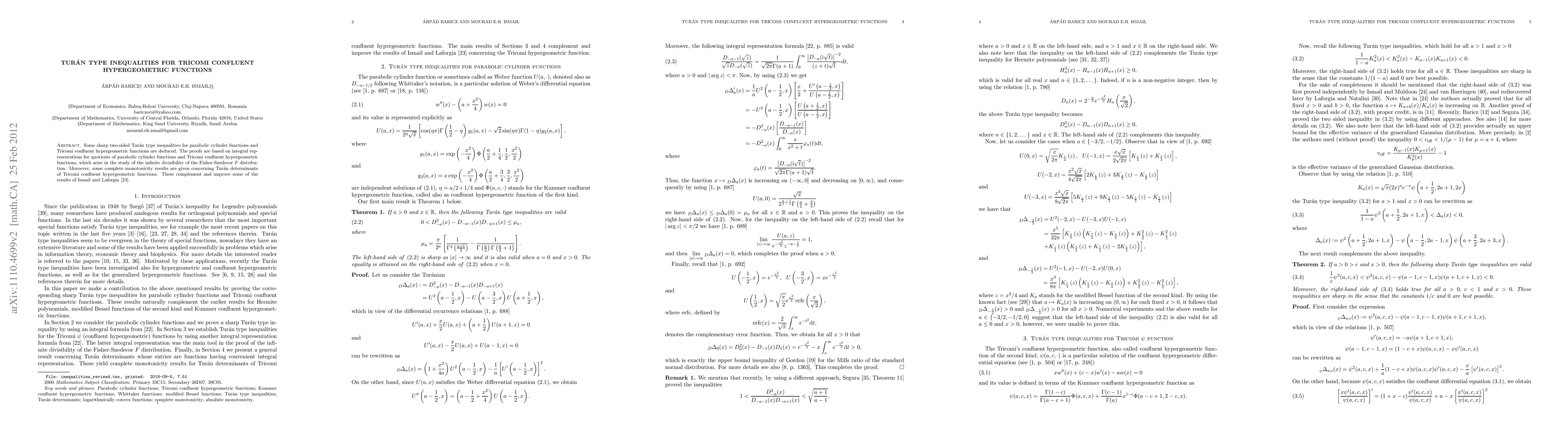 This paper derives sharp two-sided Turán type inequalities for parabolic cylinder and Tricomi confluent hypergeometric functions, using integral representations and improving upon previous results by Ismail and Laforgia, with applications to the infinite divisibility of the Fisher-Snedecor F distribution. Complete monotonicity results for Turán determinants of these functions are also presented.