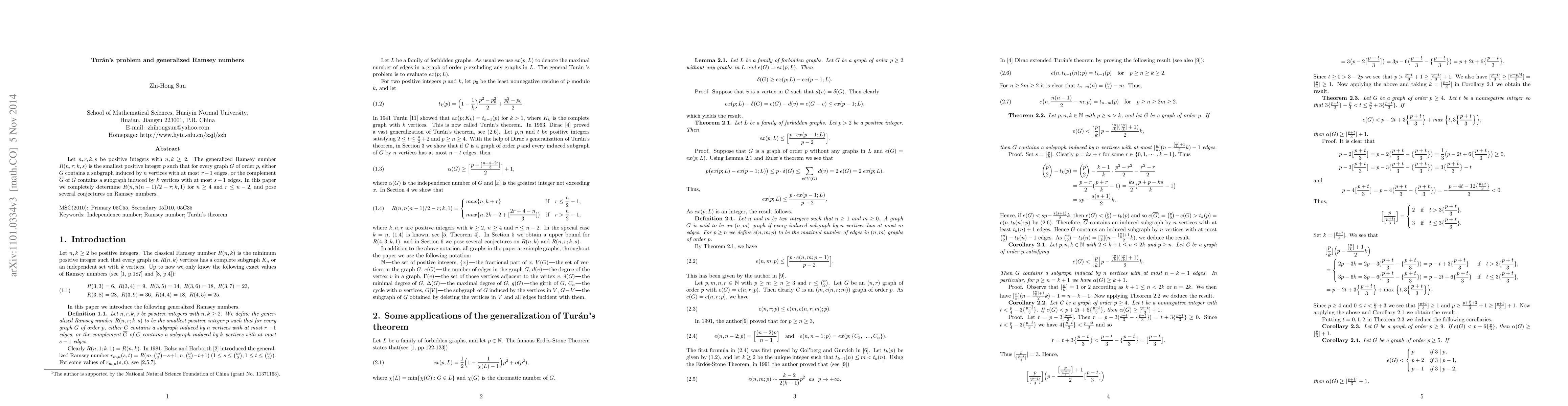 This paper solves Turan's problem for generalized Ramsey numbers, determining the smallest number $p$ such that certain subgraphs exist in graphs of order $p$, and poses several conjectures on Ramsey numbers.