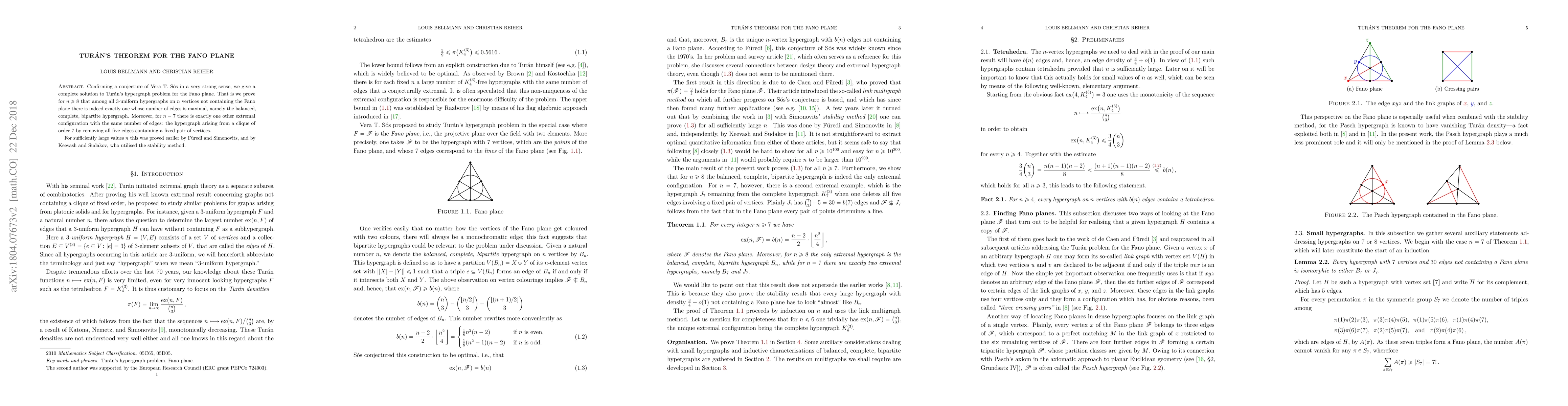 The paper provides a complete solution to Turán's hypergraph problem for the Fano plane by proving that for $n\ge 8$, there is exactly one extremal 3-uniform hypergraph on $n$ vertices not containing the Fano plane, which is the balanced, complete, bipartite hypergraph. For $n=7$, an additional extremal configuration is identified.