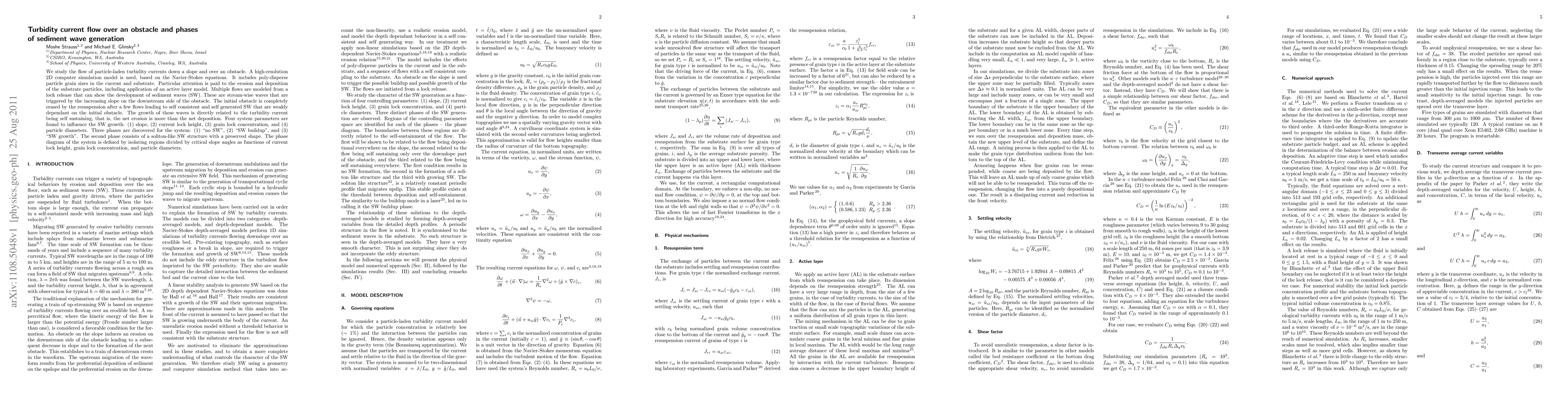 This study uses high-resolution 2D simulations to model turbidity currents over an obstacle, revealing the development of sediment waves influenced by slope, current height, grain concentration, and particle size. Three phases of sediment wave generation are identified: "no SW", "SW buildup", and "SW growth".