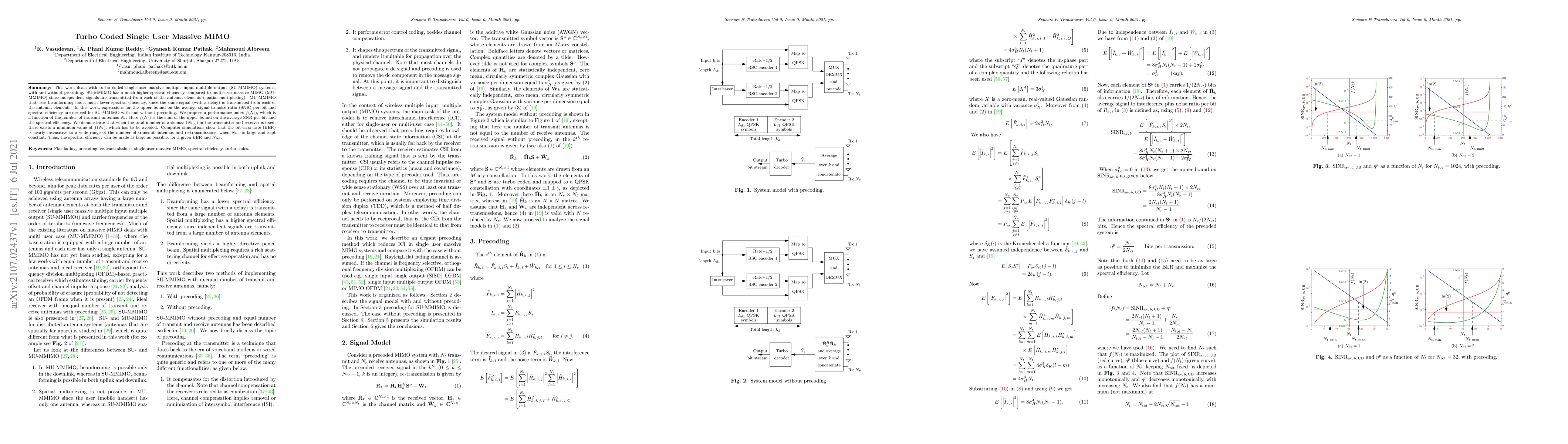 Researchers studied turbo coded single user massive MIMO systems with and without precoding, finding that spectral efficiency can be made large despite near-insensitive bit-error-rate performance for a given BER and total number of antennas.