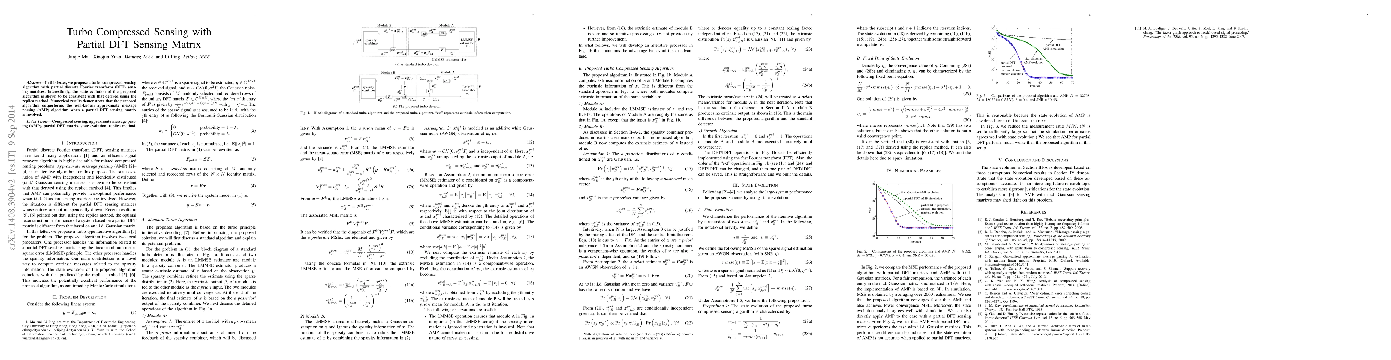 This paper introduces a turbo compressed sensing algorithm utilizing partial DFT sensing matrices, demonstrating through numerical results that it outperforms the approximate message passing algorithm in scenarios involving partial DFT matrices. The state evolution aligns with theoretical predictions from the replica method.