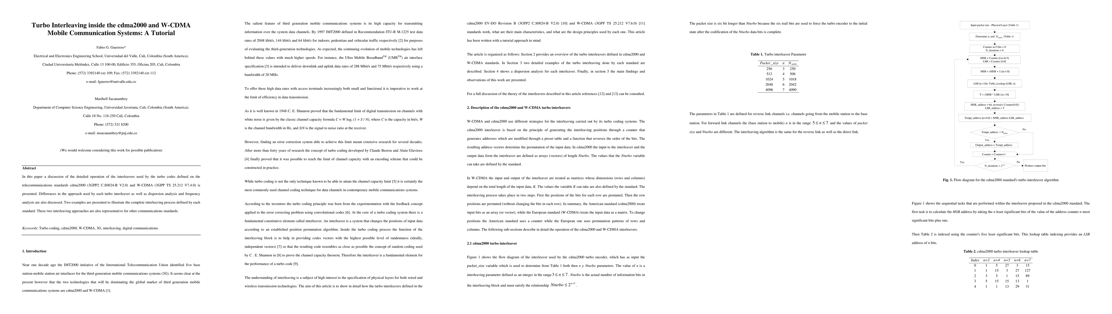 This paper provides a detailed examination of turbo interleavers in cdma2000 and W-CDMA mobile communication systems, highlighting differences in their operational approaches and analyzing dispersion and frequency aspects. It also includes examples to illustrate the complete interleaving process for each standard.