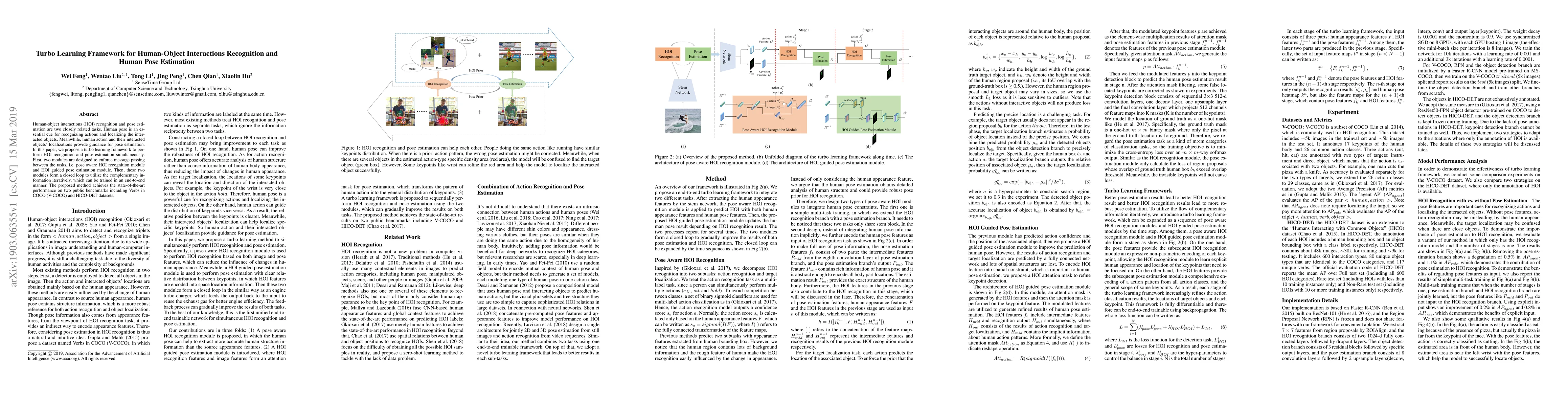 The paper proposes a turbo learning framework for simultaneous human-object interaction recognition and human pose estimation, utilizing mutual information between the two tasks to iteratively improve performance. The framework achieves state-of-the-art results on V-COCO and HICO-DET datasets.