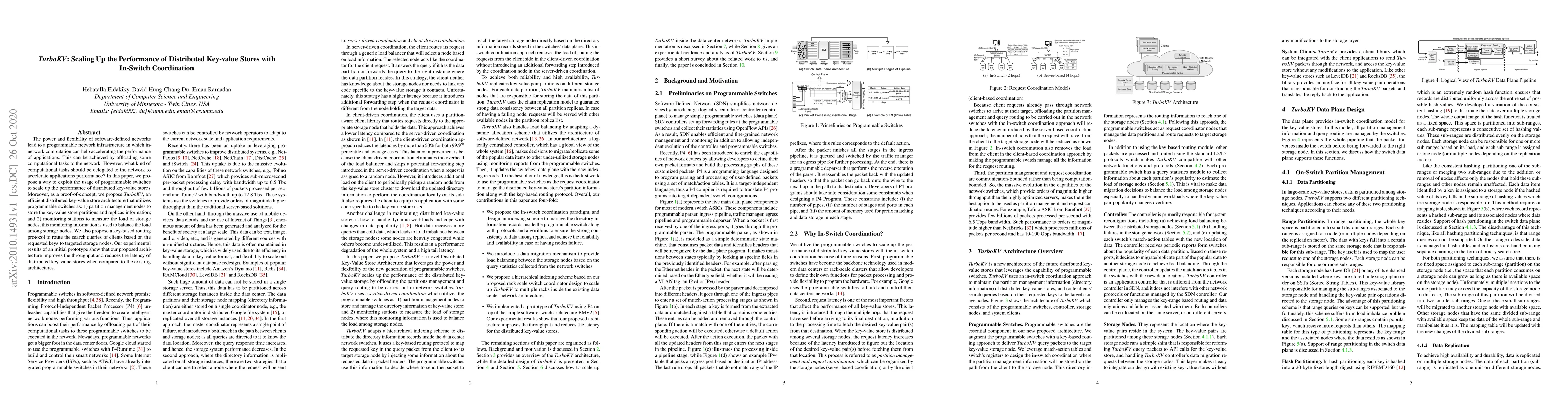This paper proposes TurboKV, an architecture for distributed key-value stores that leverages programmable switches for partition management and load balancing, along with a key-based routing protocol. Experimental results indicate improved performance in terms of throughput and reduced latency compared to existing architectures.