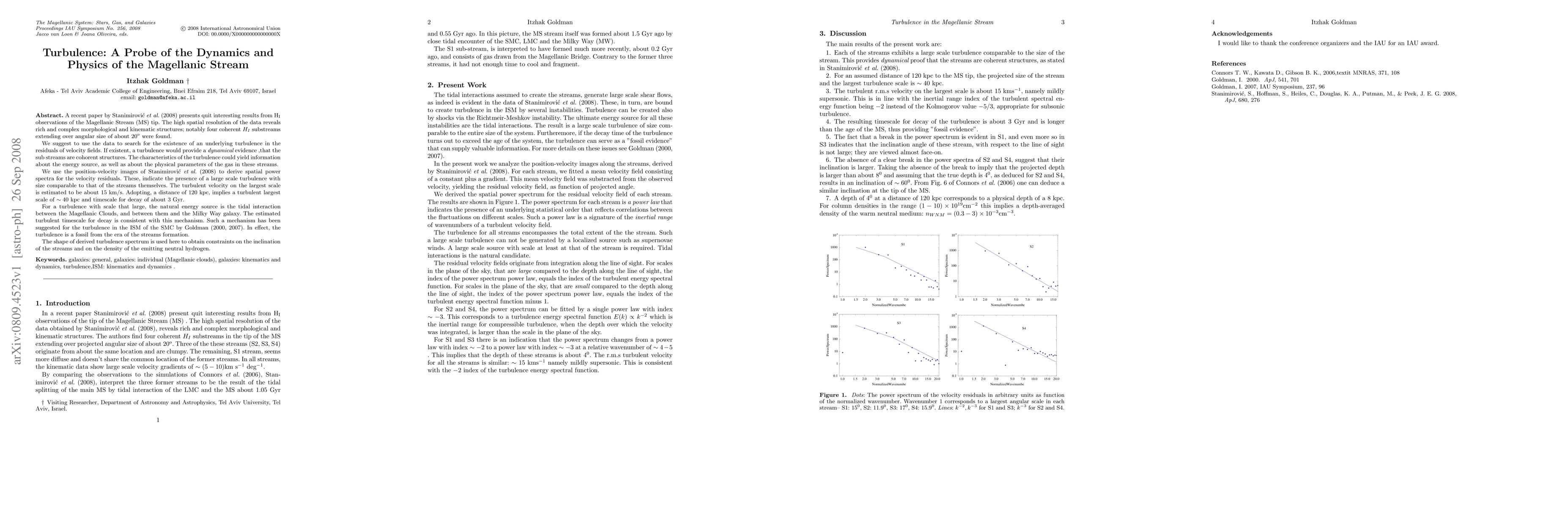 A recent paper by Stanimirovic etal (2008) presents quit interesting results from HI observations of the Magellanic Stream (MS) tip. The high spatial resolution of the data reveals rich and complex morphological and kinematic structures; notably four coherent HI substreams extending over angular size of about 20 deg were found. We use the position-velocity images of Stanimirovic etal (2008) to derive spatial power spectra for the velocity residuals. These, indicate the presence of a large scale turbulence with size comparable to that of the streams themselves. The turbulent velocity on the largest scale is estimated to be about 15 km/s . Adopting, a distance of 120 kpc, implies a turbulent largest scale of 40 kpc and timescale for decay of about 3 Gyr. For a turbulence with scale that large, the natural energy source is the tidal interaction between the Magellanic Clouds, and between them and the Milky Way galaxy. The shape of derived turbulence spectrum is used here to obtain constraints on the inclination of the streams and on the density of the emitting neutral hydrogen.