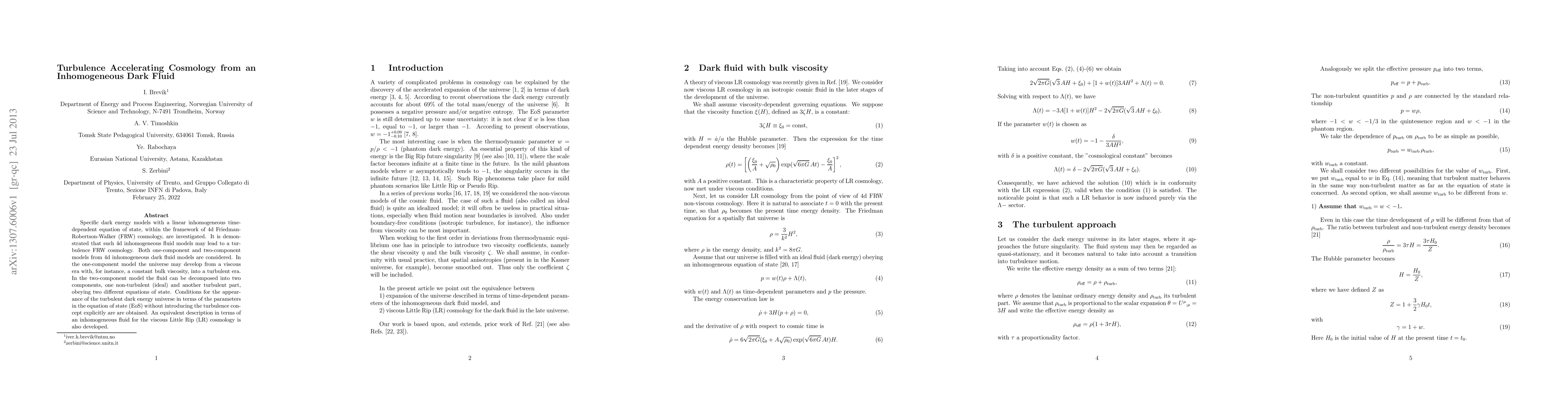 This research investigates dark energy models with inhomogeneous dark fluid in 4d FRW cosmology, showing that such models can lead to a turbulence-driven cosmological evolution. It explores both one-component and two-component models, deriving conditions for the transition into a turbulent era and developing an inhomogeneous fluid description for viscous Little Rip cosmology.