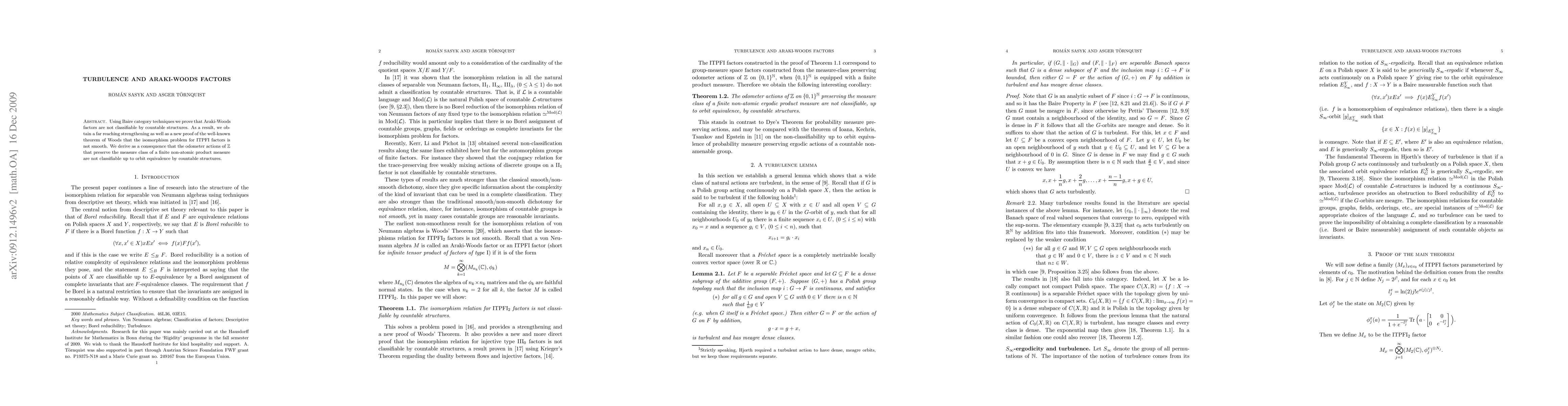 Using Baire category techniques we prove that Araki-Woods factors are not classifiable by countable structures. As a result, we obtain a far reaching strengthening as well as a new proof of the well-known theorem of Woods that the isomorphism problem for ITPFI factors is not smooth. We derive as a consequence that the odometer actions of Z that preserve the measure class of a finite non-atomic product measure are not classifiable up to orbit equivalence by countable structures.
