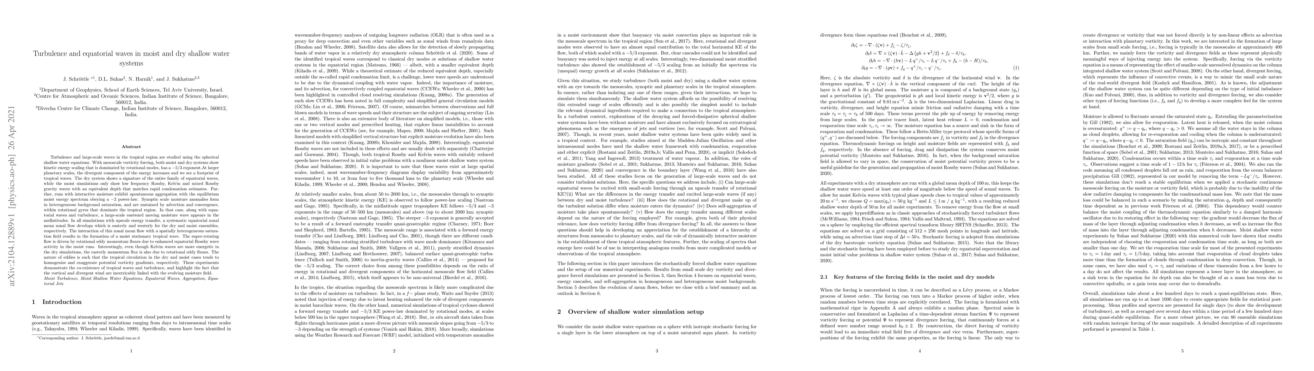 This paper investigates turbulence and equatorial waves in moist and dry shallow water systems using spherical shallow water equations. It finds that both systems exhibit a -5/3 kinetic energy scaling, but the moist system shows additional low-frequency waves and spontaneous aggregation, while the dry system displays a full range of equatorial waves.