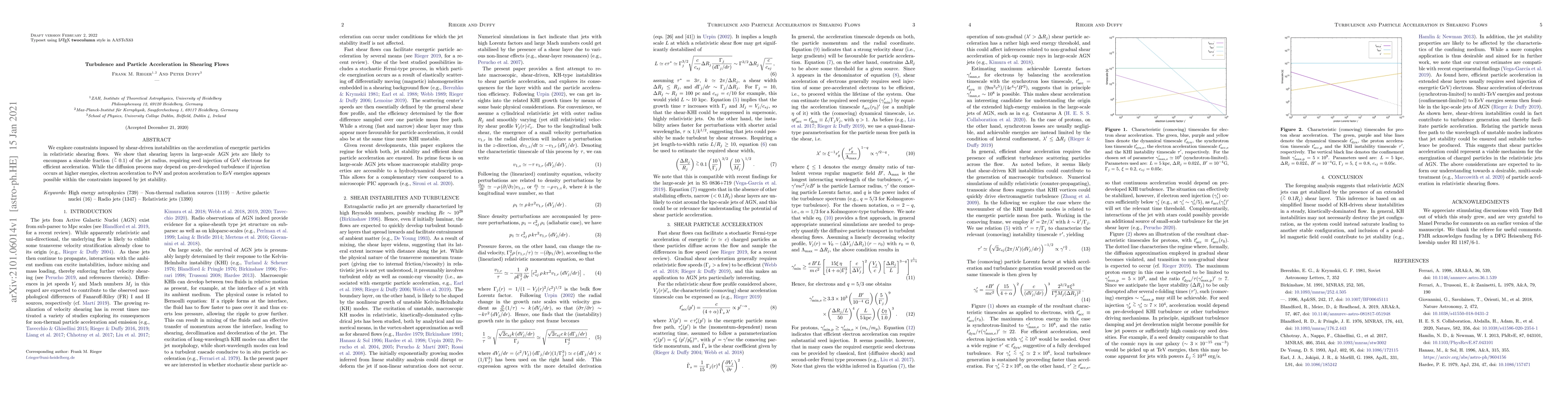 We explore constraints imposed by shear-driven instabilities on the acceleration of energetic particles in relativistic shearing flows. We show that shearing layers in large-scale AGN jets are likely to encompass a sizeable fraction ($\geq 0.1$) of the jet radius, requiring seed injection of GeV electrons for efficient acceleration. While the diffusion process may depend on pre-developed turbulence if injection occurs at higher energies, electron acceleration to PeV and proton acceleration to EeV energies appears possible within the constraints imposed by jet stability.
