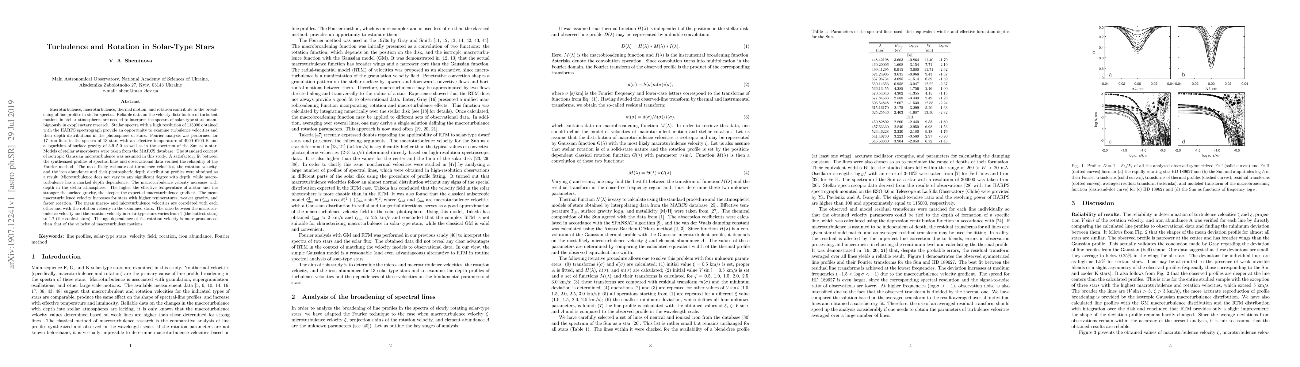 Stellar spectra with a high resolution of 115000 obtained with the HARPS spectrograph provide an opportunity to examine turbulence velocities and their depth distributions in the photosphere of stars. Fourier analysis was performed for 17 iron lines in the spectra of 13 stars with an effective temperature of 4900--6200 K and a logarithm of surface gravity of 3.9--5.0 as well as in the spectrum of the Sun as a star. Models of stellar atmospheres were taken from the MARCS database. The standard concept of isotropic Gaussian microturbulence was assumed in this study. A satisfactory fit between the synthesized profiles of spectral lines and observational data verified the reliability of the Fourier method. The most likely estimates of turbulence velocities, the rotation velocity, and the iron abundance and their photospheric depth distribution profiles were obtained as a result. Microturbulence does not vary to any significant degree with depth, while macroturbulence has a marked depth dependence. The macroturbulence velocity increases with depth in the stellar atmosphere. The higher the effective temperature of a star and the stronger the surface gravity, the steeper the expected macroturbulence gradient. The mean macroturbulence velocity increases for stars with higher temperatures, weaker gravity, and faster rotation. The mean macro- and microturbulence velocities are correlated with each other and with the rotation velocity in the examined stars. The ratio between the macroturbulence velocity and the rotation velocity in solar-type stars varies from 1 (the hottest stars) to 1.7 (the coolest stars). The age dependence of the rotation velocity is more pronounced than that of the velocity of macroturbulent motions.