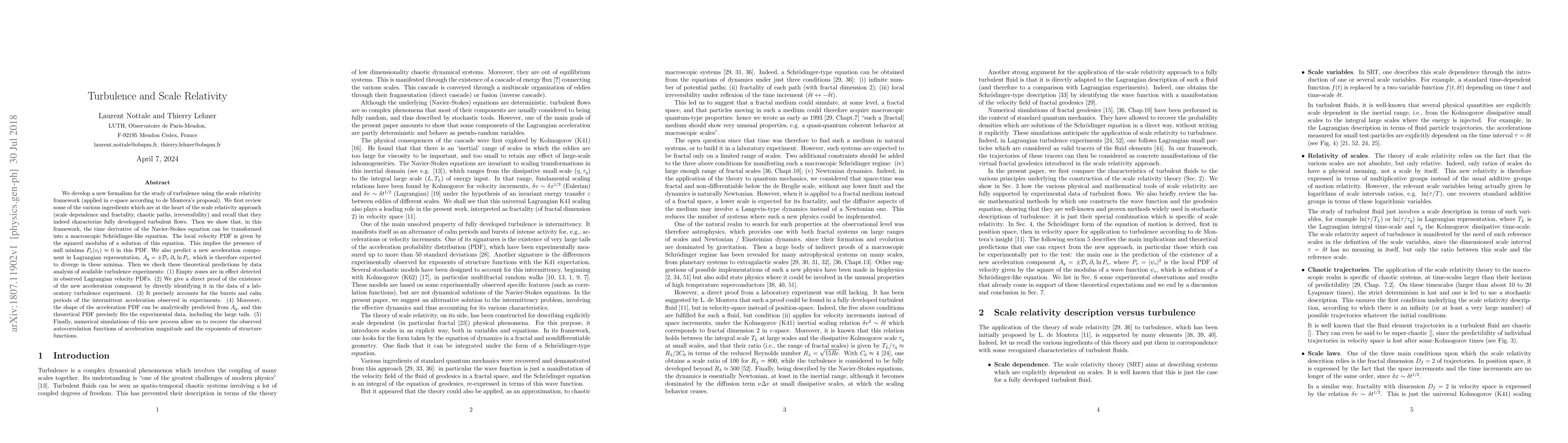 We develop a new formalism for the study of turbulence using the scale relativity framework (applied in $v$-space according to de Montera's proposal). We first review some of the various ingredients which are at the heart of the scale relativity approach (scale dependence and fractality, chaotic paths, irreversibility) and recall that they indeed characterize fully developped turbulent flows. Then we show that, in this framework, the time derivative of the Navier-Stokes equation can be transformed into a macroscopic Schr\"odinger-like equation. The local velocity PDF is given by the squared modulus of a solution of this equation. This implies the presence of null minima $P_v(v_i)\approx 0$ in this PDF. We also predict a new acceleration component in Lagrangian representation, $A_q=\pm D_v \: d \ln P_v/dv$, which is therefore expected to diverge in these minima. Then we check these theoretical predictions by data analysis of available turbulence experiments: (1) Empty zones are in effect detected in observed Lagrangian velocity PDFs. (2) We give a direct proof of the existence of the new acceleration component by directly identifying it in the data of a laboratory turbulence experiment. (3) It precisely accounts for the bursts and calm periods of the intermittent acceleration observed in experiments. (4) Moreover, the shape of the acceleration PDF can be analytically predicted from $A_q$, and this theoretical PDF precisely fits the experimental data, including the large tails. (5) Finally, numerical simulations of this new process allow us to recover the observed autocorrelation functions of acceleration magnitude and the exponents of structure functions.