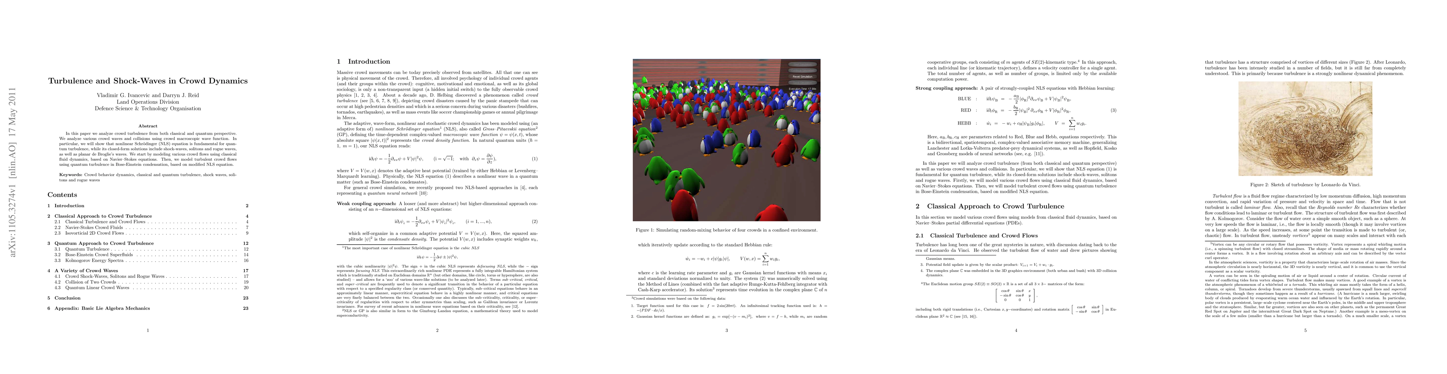 This paper explores crowd dynamics through classical and quantum turbulence, employing macroscopic wave functions and the nonlinear Schrödinger equation to model crowd waves and collisions. It highlights the fundamental role of the modified NLS equation in describing quantum turbulence and its solutions, including shock-waves, solitons, and rogue waves.