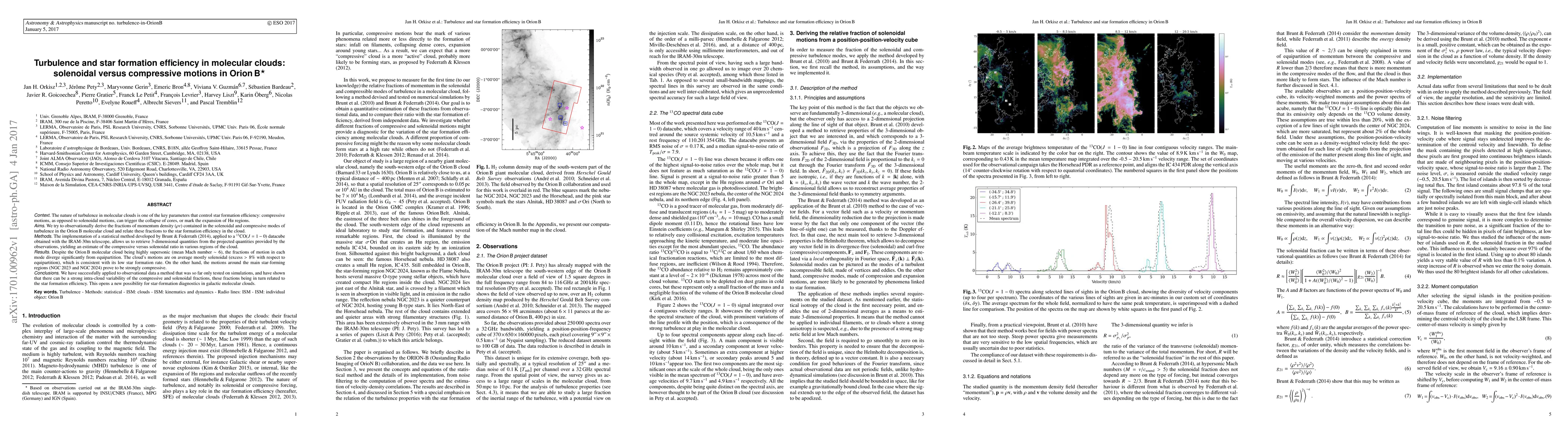 The nature of turbulence in molecular clouds is one of the key parameters that control star formation efficiency: compressive motions, as opposed to solenoidal motions, can trigger the collapse of cores, or mark the expansion of Hii regions. We try to observationally derive the fractions of momentum density ($\rho v$) contained in the solenoidal and compressive modes of turbulence in the Orion B molecular cloud and relate these fractions to the star formation efficiency in the cloud. The implementation of a statistical method developed by Brunt & Federrath (2014), applied to a $^{13}$CO(J=1-0) datacube obtained with the IRAM-30m telescope, allows us to retrieve 3-dimensional quantities from the projected quantities provided by the observations, yielding an estimate of the compressive versus solenoidal ratio in various regions of the cloud. Despite the Orion B molecular cloud being highly supersonic (mean Mach number $\sim$ 6), the fractions of motion in each mode diverge significantly from equipartition. The cloud's motions are on average mostly solenoidal (excess > 8 % with respect to equipartition), which is consistent with its low star formation rate. On the other hand, the motions around the main star-forming regions (NGC 2023 and NGC 2024) prove to be strongly compressive. We have successfully applied to observational data a method that was so far only tested on simulations, and have shown that there can be a strong intra-cloud variability of the compressive and solenoidal fractions, these fractions being in turn related to the star formation efficiency. This opens a new possibility for star-formation diagnostics in galactic molecular clouds.