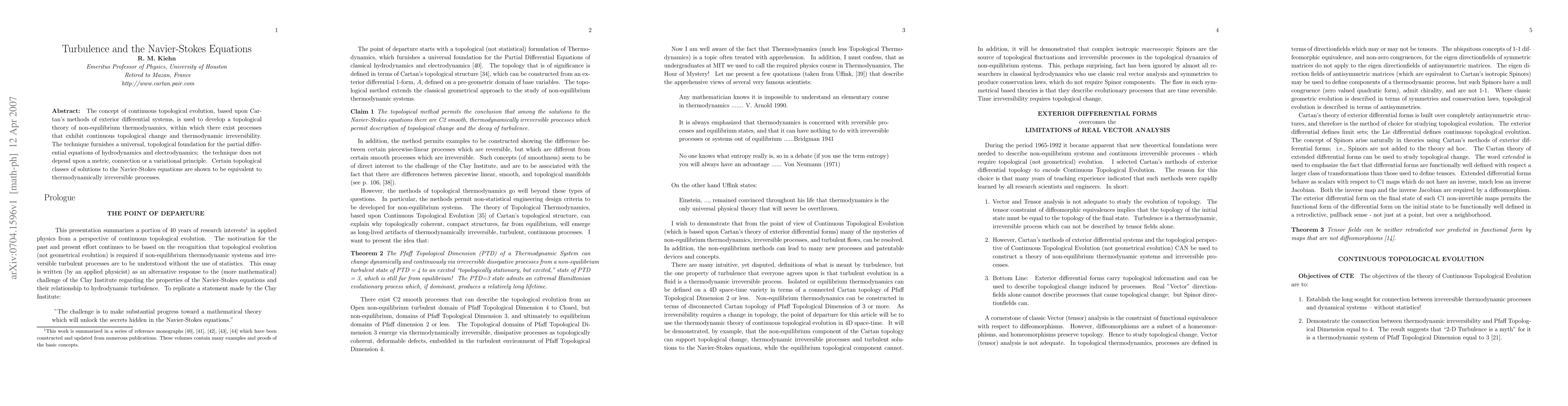 The concept of continuous topological evolution, based upon Cartan's methods of exterior differential systems, is used to develop a topological theory of non-equilibrium thermodynamics, within which there exist processes that exhibit continuous topological change and thermodynamic irreversibility. The technique furnishes a universal, topological foundation for the partial differential equations of hydrodynamics and electrodynamics; the technique does not depend upon a metric, connection or a variational principle. Certain topological classes of solutions to the Navier-Stokes equations are shown to be equivalent to thermodynamically irreversible processes.