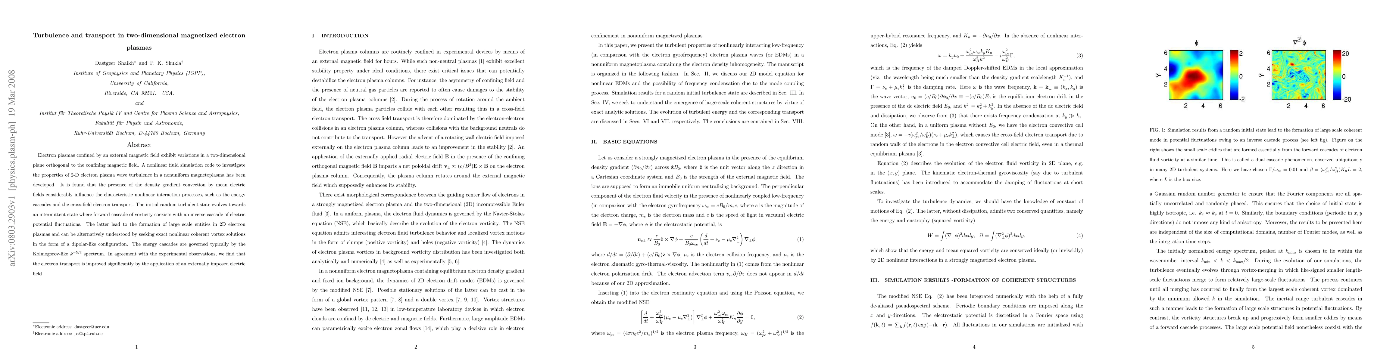 Electron plasmas confined by an external magnetic field exhibit variations in a two-dimensional plane orthogonal to the confining magnetic field. A nonlinear fluid simulation code to investigate the properties of 2-D electron plasma wave turbulence in a nonuniform magnetoplasma has been developed. It is found that the presence of the density gradient convection by mean electric fields considerably influence the characteristic nonlinear interaction processes, such as the energy cascades and the cross-field electron transport. The initial random turbulent state evolves towards an intermittent state where forward cascade of vorticity coexists with an inverse cascade of electric potential fluctuations. The latter lead to the formation of large scale entities in 2D electron plasmas and can be alternatively understood by seeking exact nonlinear coherent vortex solutions in the form of a dipolar-like configuration. The energy cascades are governed typically by the Kolmogorov-like $k^{-5/3}$ spectrum. In agreement with the experimental observations, we find that the electron transport is improved significantly by the application of an externally imposed electric field.