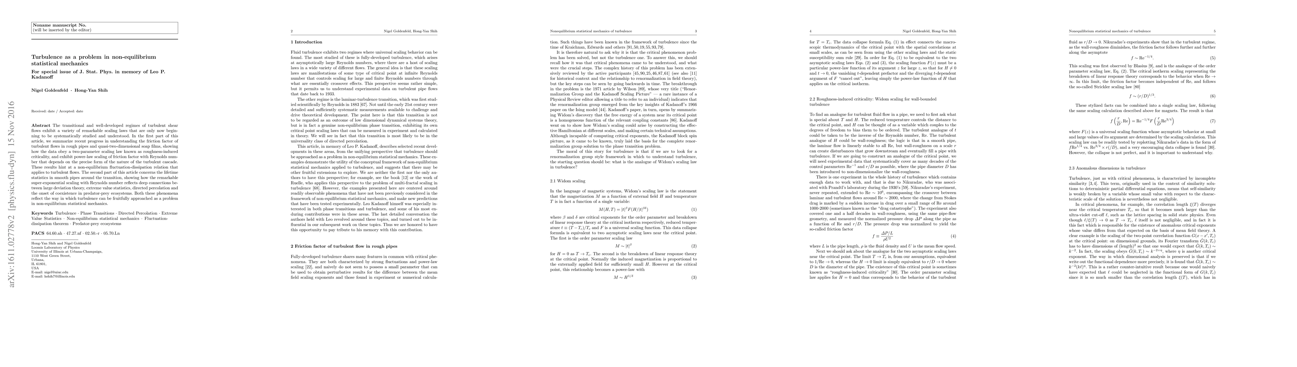 This paper explores turbulence in non-equilibrium statistical mechanics, detailing recent findings on scaling laws in turbulent shear flows, including roughness-induced criticality and power-law scaling of friction factors. It also investigates lifetime statistics in smooth pipes, linking super-exponential scaling to large deviation theory and extreme value statistics.