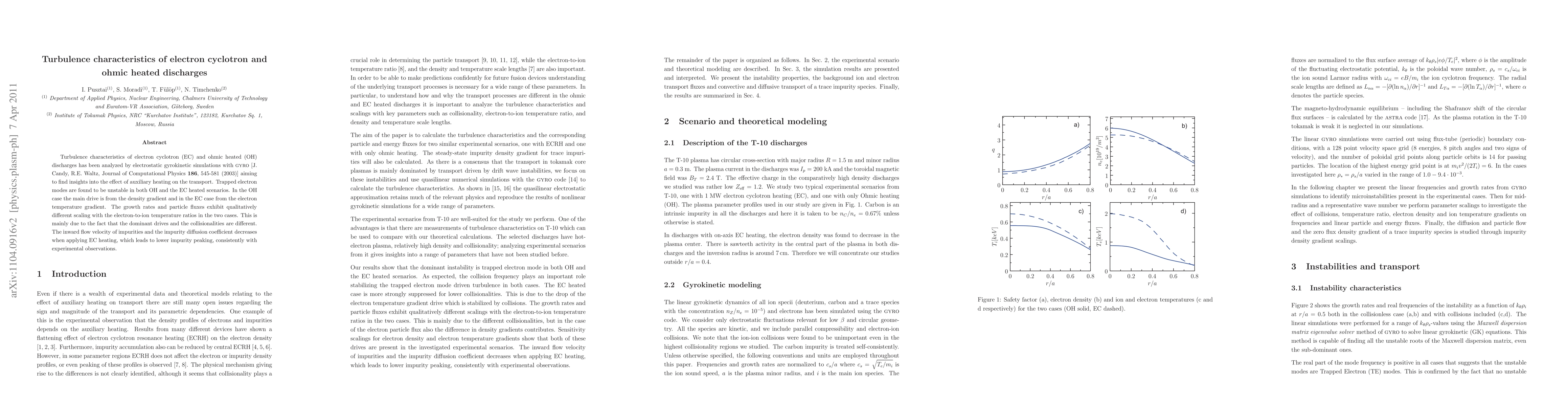 This study uses electrostatic gyrokinetic simulations to analyze turbulence in electron cyclotron (EC) and ohmic heated (OH) discharges, revealing different instabilities driven by density and temperature gradients. The EC heating reduces impurity transport and peaking, aligning with experimental data.
