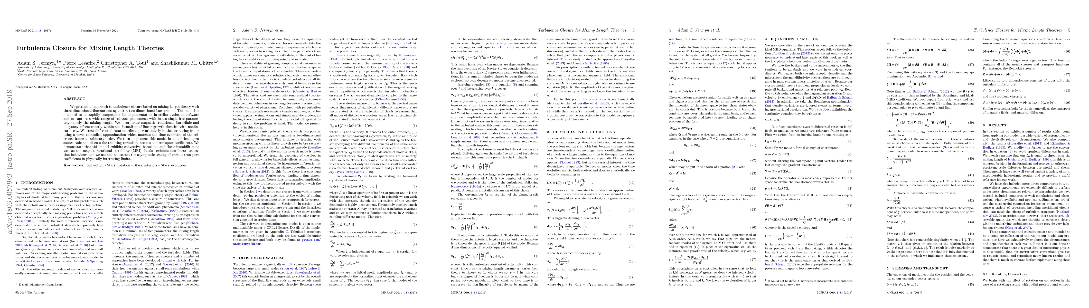 We present an approach to turbulence closure based on mixing length theory with three-dimensional fluctuations against a two-dimensional background. This model is intended to be rapidly computable for implementation in stellar evolution software and to capture a wide range of relevant phenomena with just a single free parameter, namely the mixing length. We incorporate magnetic, rotational, baroclinic and buoyancy effects exactly within the formalism of linear growth theories with nonlinear decay. We treat differential rotation effects perturbatively in the corotating frame using a novel controlled approximation which matches the time evolution of the reference frame to arbitrary order. We then implement this model in an efficient open source code and discuss the resulting turbulent stresses and transport coefficients. We demonstrate that this model exhibits convective, baroclinic and shear instabilities as well as the magnetorotational instability (MRI). It also exhibits non-linear saturation behaviour, and we use this to extract the asymptotic scaling of various transport coefficients in physically interesting limits.