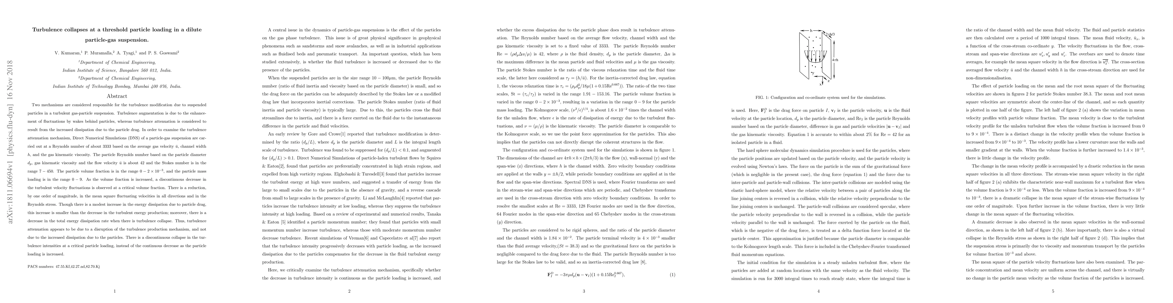 Two mechanisms are considered responsible for the turbulence modification due to suspended particles in a turbulent gas-particle suspension. Turbulence augmentation is due to the enhancement of fluctuations by wakes behind particles, whereas turbulence attenuation is considered to result from the increased dissipation due to the particle drag. In order to examine the turbulence attenuation mechanism, Direct Numerical Simulations (DNS) of a particle-gas suspension are carried out at a Reynolds number of about 3333 based on the average gas velocity $\bar{u}$, channel width $h$, and the gas kinematic viscosity. The particle Reynolds number based on the particle diameter $d_p$, gas kinematic viscosity and the flow velocity $\bar{u}$ is about 42 and the Stokes number is in the range $7-450$. The particle volume fraction is in the range $0-2 \times 10^{-3}$, and the particle mass loading is in the range $0-9$. As the volume fraction is increased, a discontinuous decrease in the turbulent velocity fluctuations is observed at a critical volume fraction. from $9 \times 10^{-4}$ to $1 \times 10^{-3}$. There is a reduction, by one order of magnitude, in the mean square fluctuating velocities in all directions and in the Reynolds stress. Though there is a modest increase in the energy dissipation due to particle drag, this increase is smaller than the decrease in the turbulent energy production; moreover, there is a decrease in the total energy dissipation rate when there is turbulence collapse. Thus, turbulence attenuation appears to be due to a disruption of the turbulence production mechanism, and not due to the increased dissipation due to the particles. There is a discontinuous collapse in the turbulence intensities at a critical particle loading, instead of the continuous decrease as the particle loading is increased.