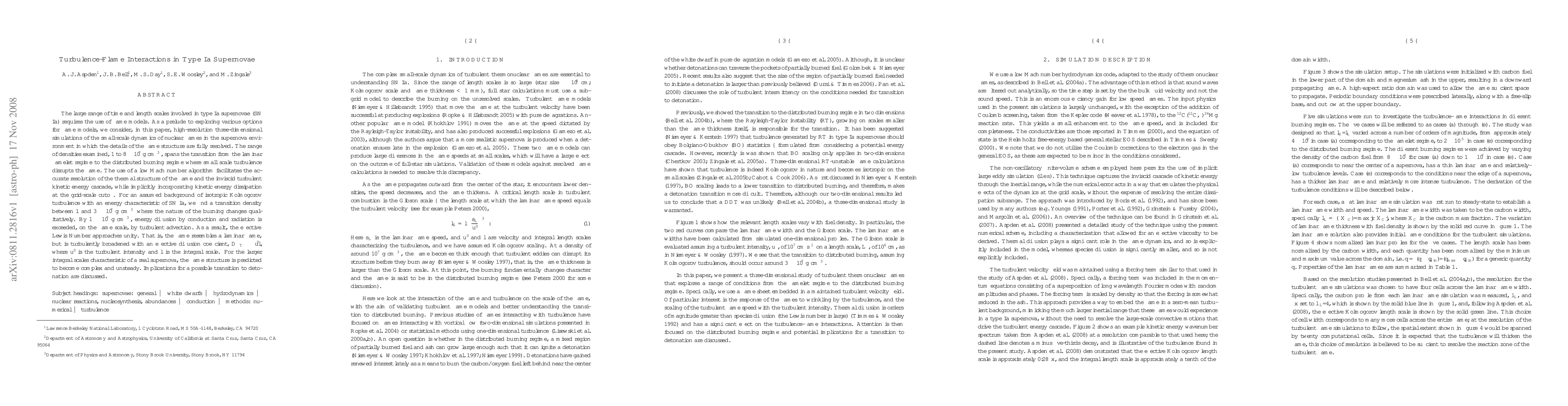 The large range of time and length scales involved in type Ia supernovae (SN Ia) requires the use of flame models. As a prelude to exploring various options for flame models, we consider, in this paper, high-resolution three-dimensional simulations of the small-scale dynamics of nuclear flames in the supernova environment in which the details of the flame structure are fully resolved. The range of densities examined, 1 to $8 \times 10^7$ g cm$^{-3}$, spans the transition from the laminar flamelet regime to the distributed burning regime where small scale turbulence disrupts the flame. The use of a low Mach number algorithm facilitates the accurate resolution of the thermal structure of the flame and the inviscid turbulent kinetic energy cascade, while implicitly incorporating kinetic energy dissipation at the grid-scale cutoff. For an assumed background of isotropic Kolmogorov turbulence with an energy characteristic of SN Ia, we find a transition density between 1 and $3 \times 10^7$ g cm$^{-3}$ where the nature of the burning changes qualitatively. By $1 \times 10^7$ g cm$^{-3}$, energy diffusion by conduction and radiation is exceeded, on the flame scale, by turbulent advection. As a result, the effective Lewis Number approaches unity. That is, the flame resembles a laminar flame, but is turbulently broadened with an effective diffusion coefficient, $D_T \sim u' l$, where $u'$ is the turbulent intensity and $l$ is the integral scale. For the larger integral scales characteristic of a real supernova, the flame structure is predicted to become complex and unsteady. Implications for a possible transition to detonation are discussed.