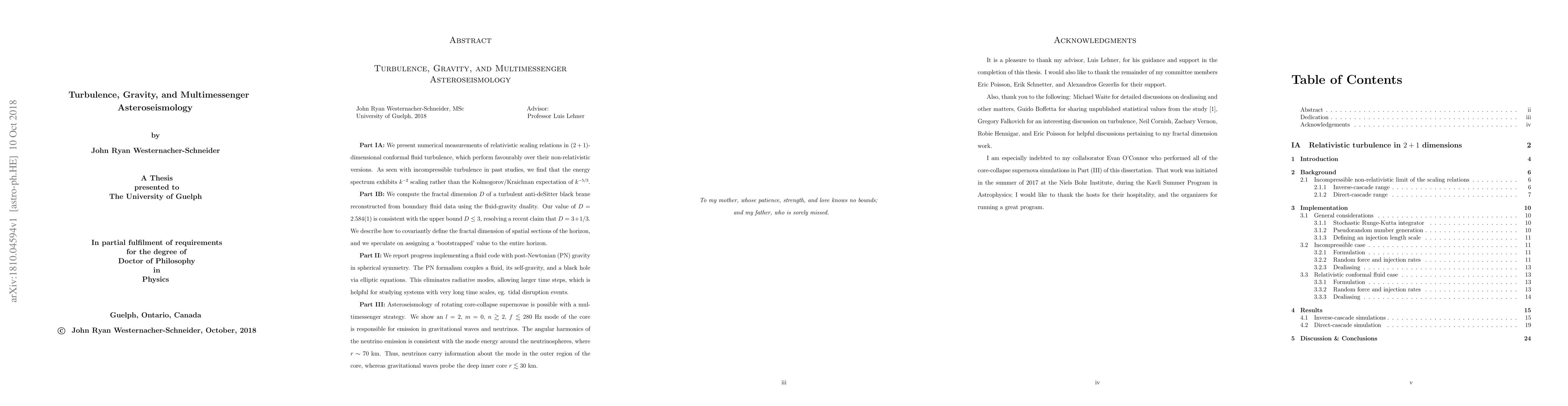 Part IA: We present numerical measurements of relativistic scaling relations in $(2+1)$-dimensional conformal fluid turbulence, which perform favourably over their non-relativistic versions. As seen with incompressible turbulence in past studies, we find that the energy spectrum exhibits $k^{-2}$ scaling rather than the Kolmogorov/Kraichnan expectation of $k^{-5/3}$. Part IB: We compute the fractal dimension $D$ of a turbulent anti-deSitter black brane reconstructed from boundary fluid data using the fluid-gravity duality. Our value of $D=2.584(1)$ is consistent with the upper bound $D\leq 3$, resolving a recent claim that $D=3+1/3$. We describe how to covariantly define the fractal dimension of spatial sections of the horizon, and we speculate on assigning a `bootstrapped' value to the entire horizon. Part II: We report progress implementing a fluid code with post-Newtonian (PN) gravity in spherical symmetry. The PN formalism couples a fluid, its self-gravity, and a black hole via elliptic equations. This eliminates radiative modes, allowing larger time steps, which is helpful for studying systems with very long time scales, eg. tidal disruption events. Part III: Asteroseismology of rotating core-collapse supernovae is possible with a multimessenger strategy. We show an $l=2$, $m=0$, $n\gtrsim 2$, $f\lesssim 280$ Hz mode of the core is responsible for emission in gravitational waves and neutrinos. The angular harmonics of the neutrino emission is consistent with the mode energy around the neutrinospheres, where $r\sim 70$ km. Thus, neutrinos carry information about the mode in the outer region of the core, whereas gravitational waves probe the deep inner core $r \lesssim 30$ km.