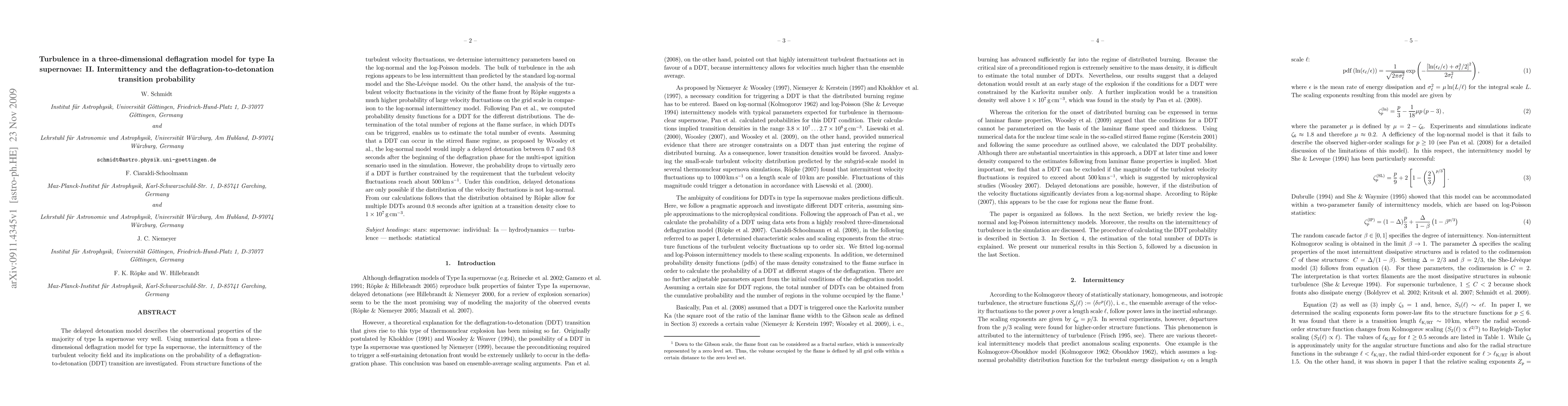 Researchers studied turbulence in type Ia supernovae using a 3D deflagration model to investigate the probability of a deflagration-to-detonation transition, finding that certain distributions allow for multiple detonations within a short timeframe.