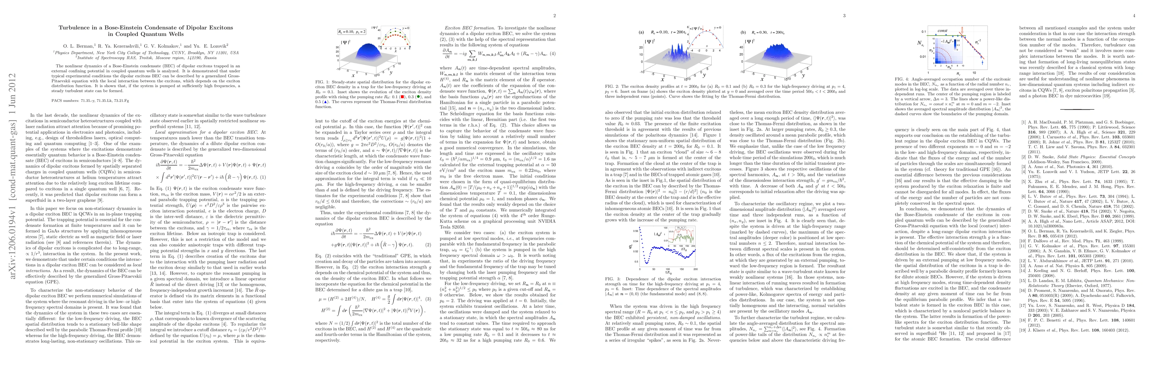 The research analyzes the nonlinear dynamics of a Bose-Einstein condensate of dipolar excitons in coupled quantum wells, showing that it can be described by a generalized Gross-Pitaevskii equation. High-frequency pumping can induce a steady turbulent state in the system.