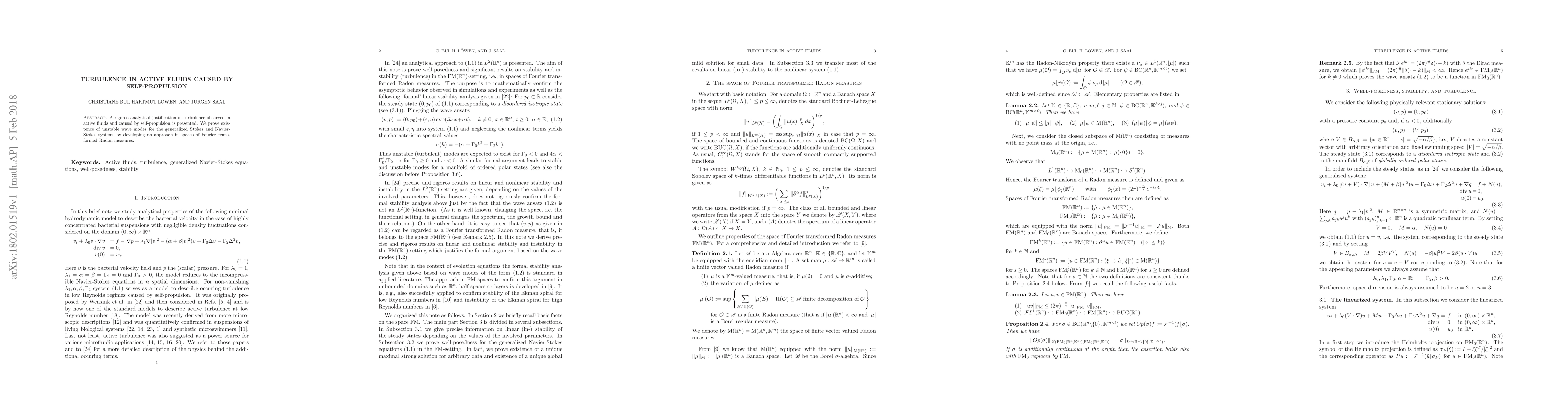 A rigoros analytical justification of turbulence observed in active fluids and caused by self-propulsion is presented. We prove existence of unstable wave modes for the generalized Stokes and Navier-Stokes systems by developing an approach in spaces of Fourier transformed Radon measures.
