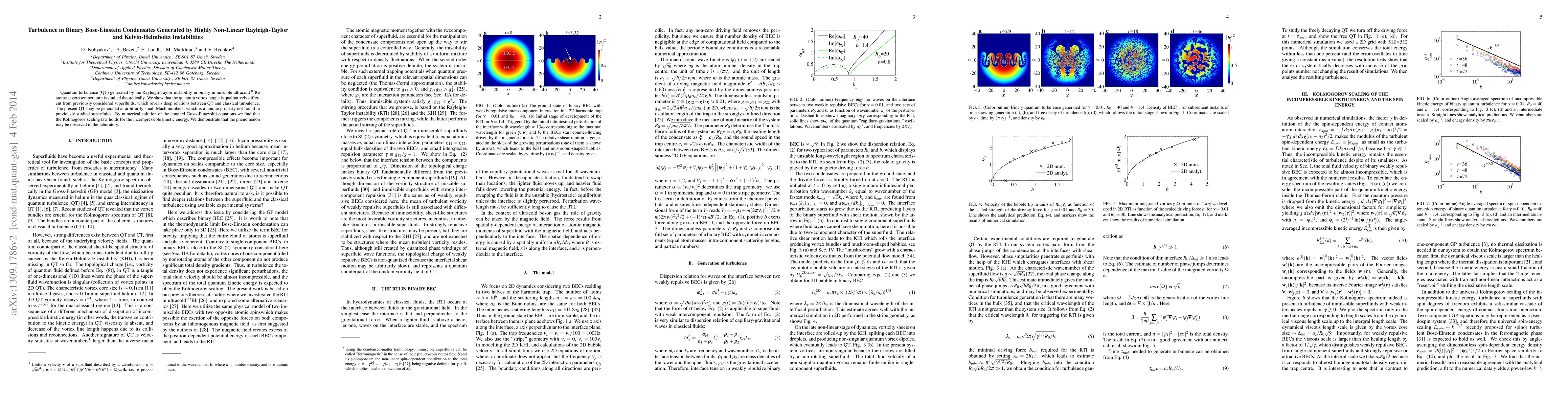 Quantum turbulence (QT) generated by the Rayleigh-Taylor instability in binary immiscible ultracold 87Rb atoms at zero temperature is studied theoretically. We show that the quantum vortex tangle is qualitatively different from previously considered superfluids, which reveals deep relations between QT and classical turbulence. The present QT may be generated at arbitrarily small Mach numbers, which is a unique property not found in previously studied superfluids. By numerical solution of the coupled Gross-Pitaevskii equations we find that the Kolmogorov scaling law holds for the incompressible kinetic energy. We demonstrate that the phenomenon may be observed in the laboratory.