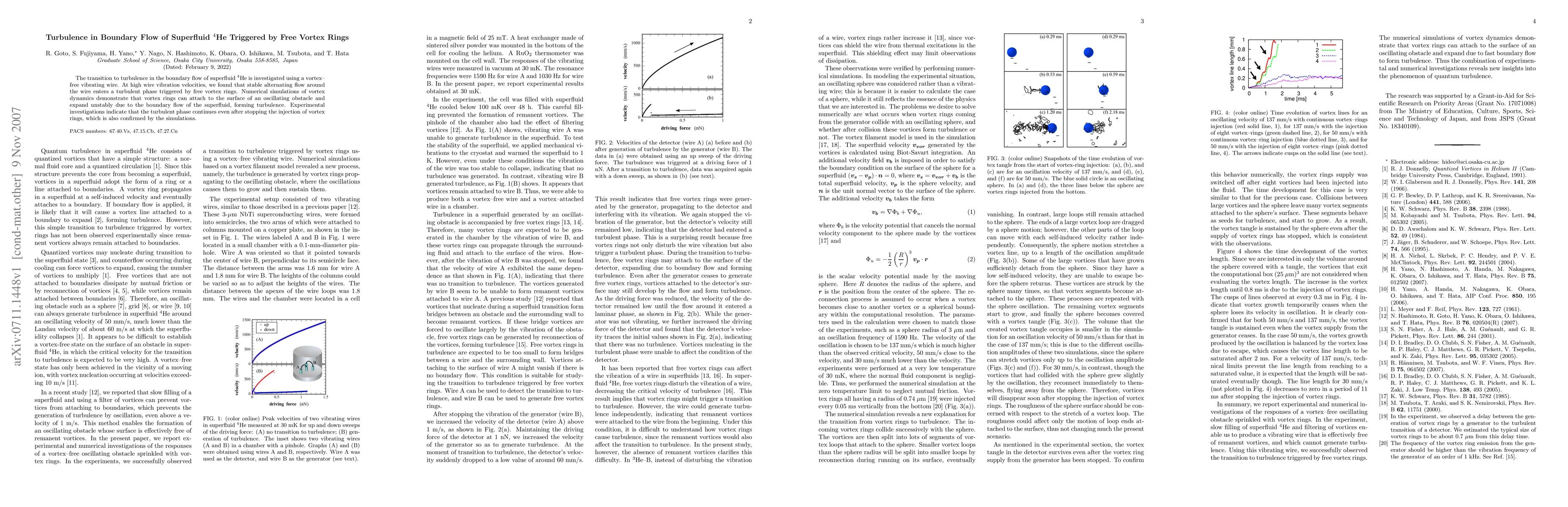 This study investigates how turbulence in boundary flow of superfluid $^4$He is triggered by free vortex rings, finding that high wire vibration velocities induce a transition to turbulence. Numerical simulations show vortex rings attach to and destabilize due to the oscillating wire, confirming experimental observations of persistent turbulence.