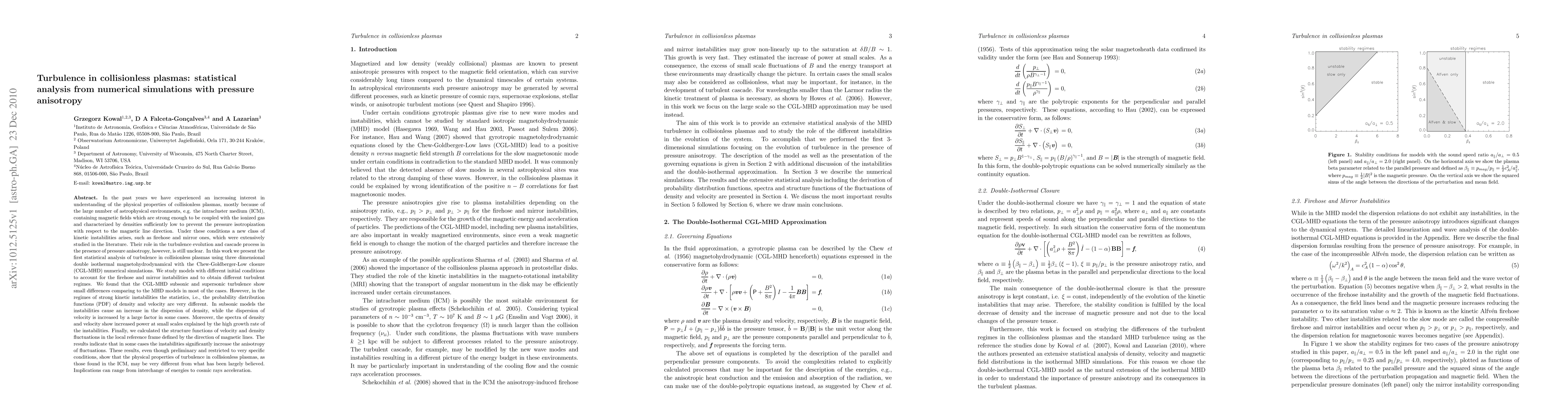 This paper presents a statistical analysis of turbulence in collisionless plasmas using CGL-MHD simulations, focusing on the effects of pressure anisotropy and kinetic instabilities like firehose and mirror instabilities. The study reveals that these instabilities significantly alter the statistical properties of turbulence, suggesting that plasma turbulence in environments like the intracluster medium may behave differently than previously believed.