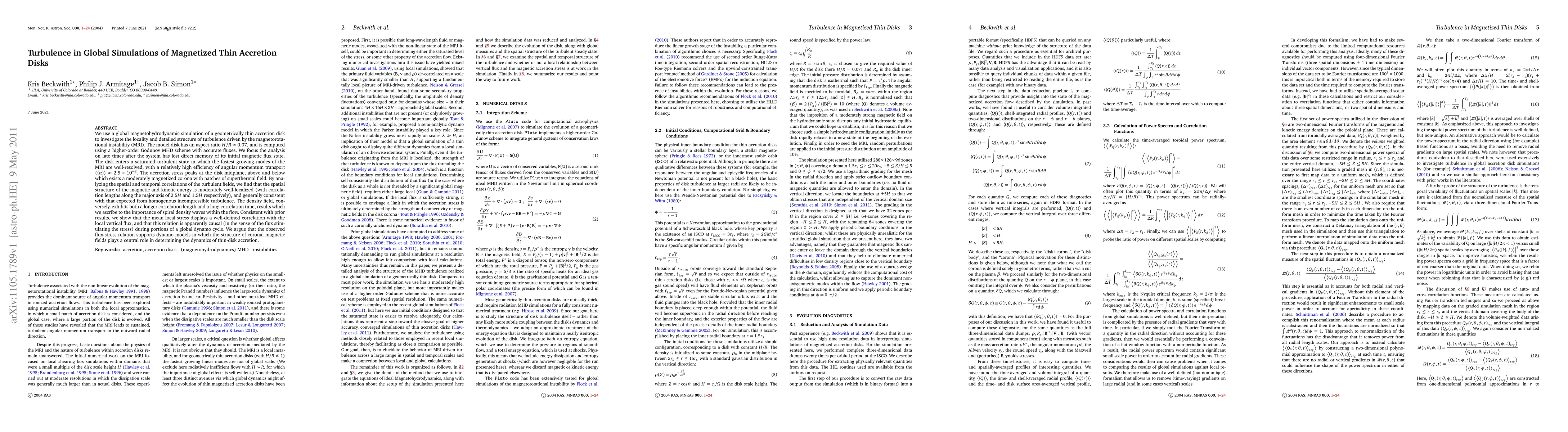 This research uses global magnetohydrodynamic simulations to study turbulence in thin accretion disks driven by the magnetorotational instability (MRI). Key findings include a saturated turbulent state with efficient angular momentum transport, localized magnetic and kinetic energy structures, and a density field influenced by spiral waves. The mean local stress correlates with vertical flux, supporting dynamo models where coronal magnetic field structure impacts thin-disk accretion dynamics.