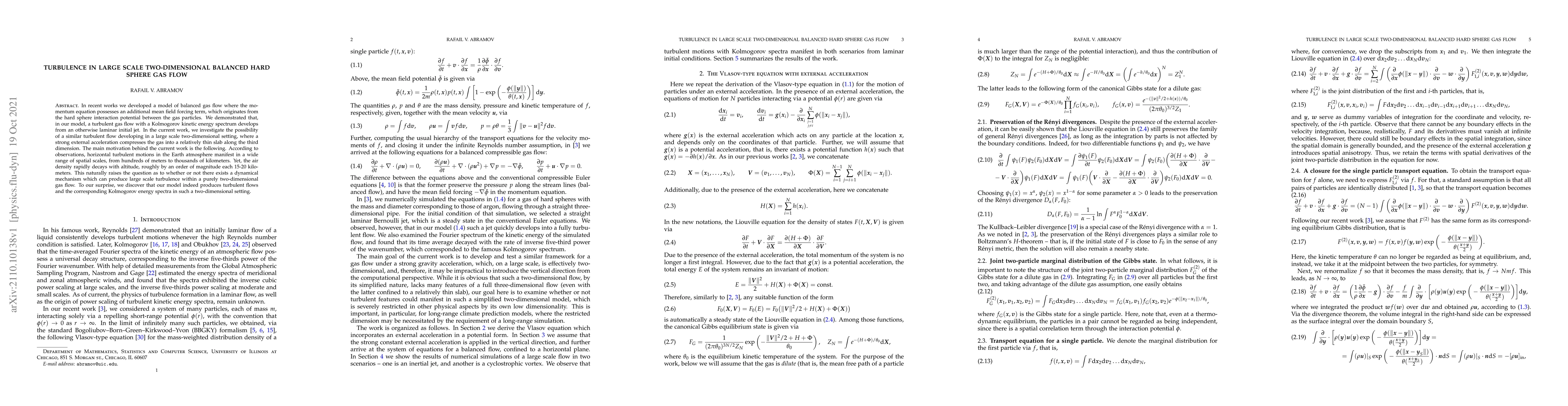 In recent works we developed a model of balanced gas flow where the momentum equation possesses an additional mean field forcing term, which originates from the hard sphere interaction potential between the gas particles. We demonstrated that, in our model, a turbulent gas flow with a Kolmogorov kinetic energy spectrum develops from an otherwise laminar initial jet. In the current work, we investigate the possibility of a similar turbulent flow developing in a large scale two-dimensional setting, where a strong external acceleration compresses the gas into a relatively thin slab along the third dimension. The main motivation behind the current work is the following. According to observations, horizontal turbulent motions in the Earth atmosphere manifest in a wide range of spatial scales, from hundreds of meters to thousands of kilometers. Yet, the air density rapidly decays with altitude, roughly by an order of magnitude each 15-20 kilometers. This naturally raises the question as to whether or not there exists a dynamical mechanism which can produce large scale turbulence within a purely two-dimensional gas flow. To our surprise, we discover that our model indeed produces turbulent flows and the corresponding Kolmogorov energy spectra in such a two-dimensional setting.